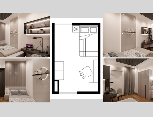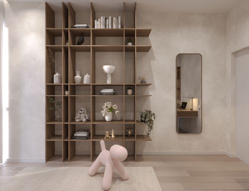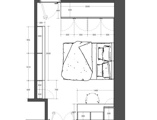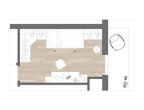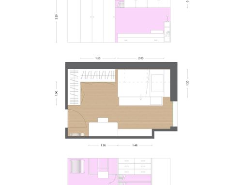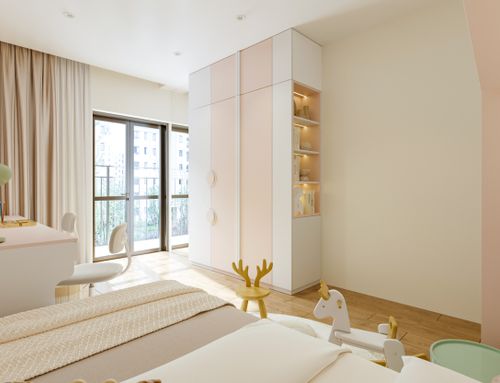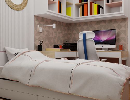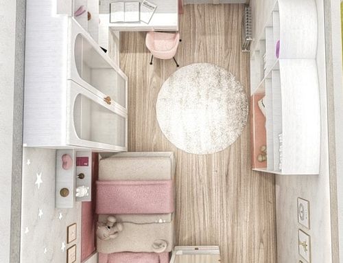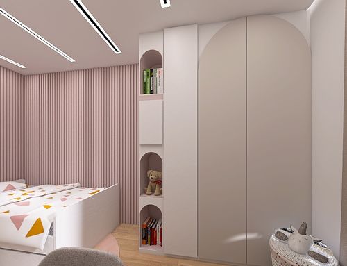 A room for a 9-year-old girl that will accompany her as she grows. Modern style. Predominantly white with colorful details if desired. A queen size bed or a pull-out bed to invite friends. Spacious wardrobes but also plenty of space for books and free space to play. A recess with spotlights has already been created on the radiator side.