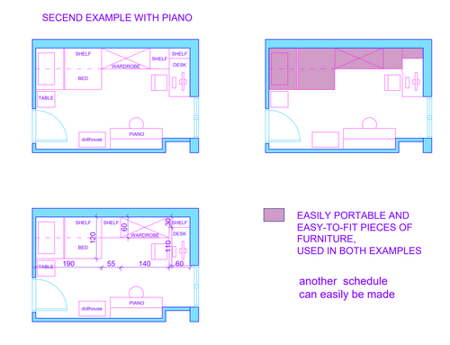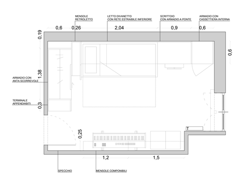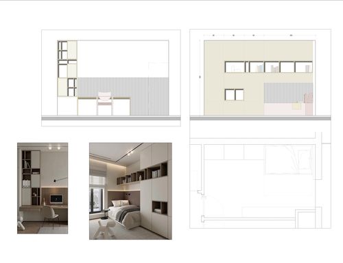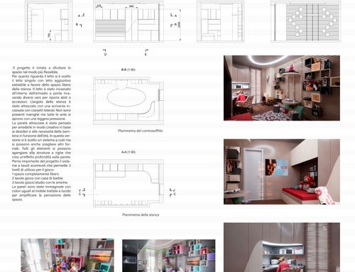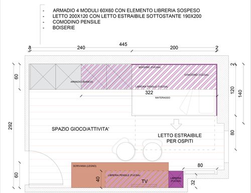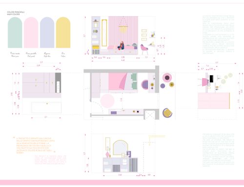 Camera per una bambina di 9 anni che dovrà accompagnarla nella crescita. Stile moderno. Colore prevalente bianco con eventuali dettagli colorati. Letto a 1 piazza e mezza o con letto estraibile per invitare le amiche. Armadiature capienti ma anche tanto spazio ai libri e spazio libero per giocare. Sul lato del termosifone è già stato fatto un ribassamento con dei faretti.