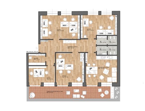 The office will be renovated by restoring the existing floor and renovating the systems, but without changing the current distribution of spaces.