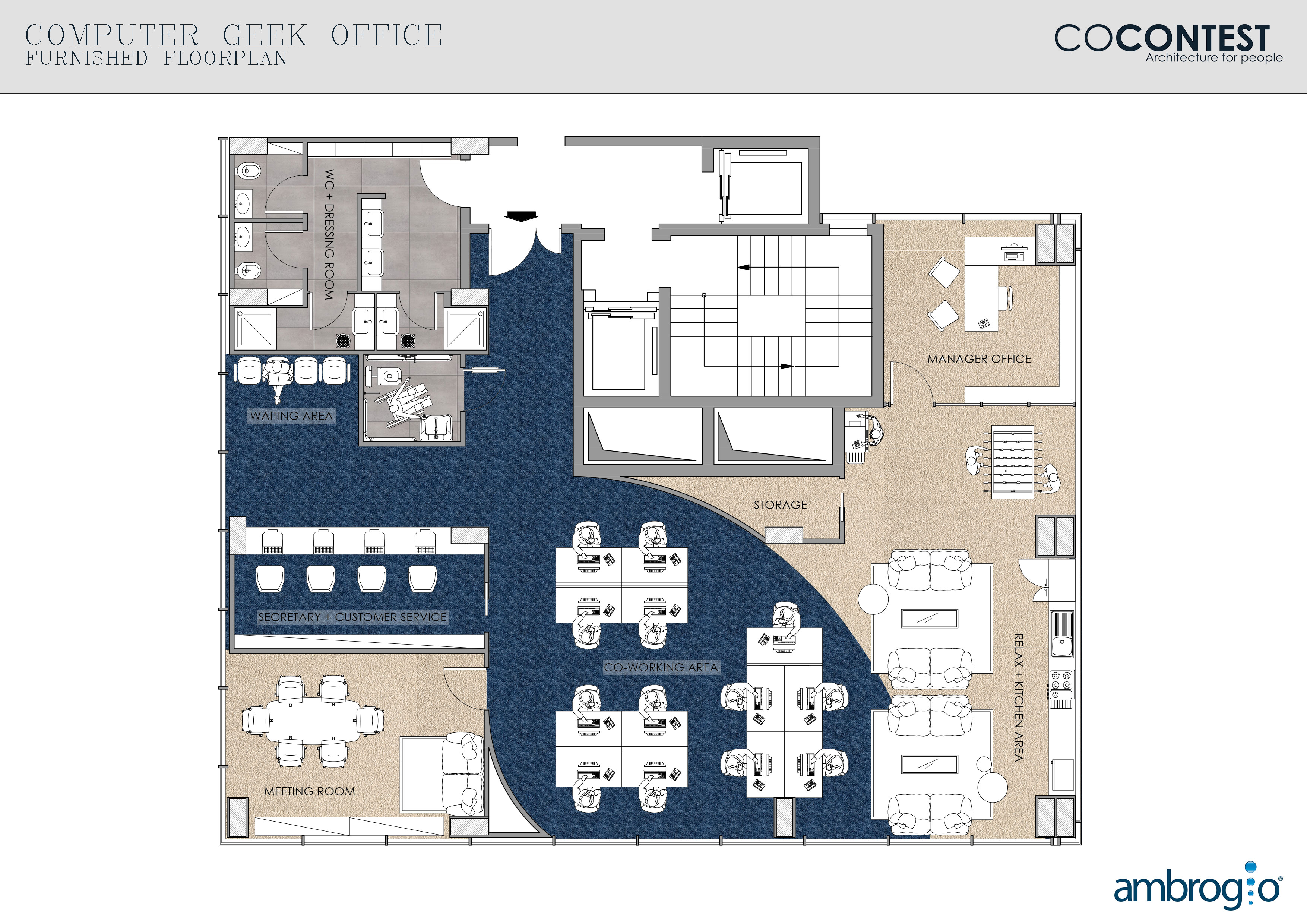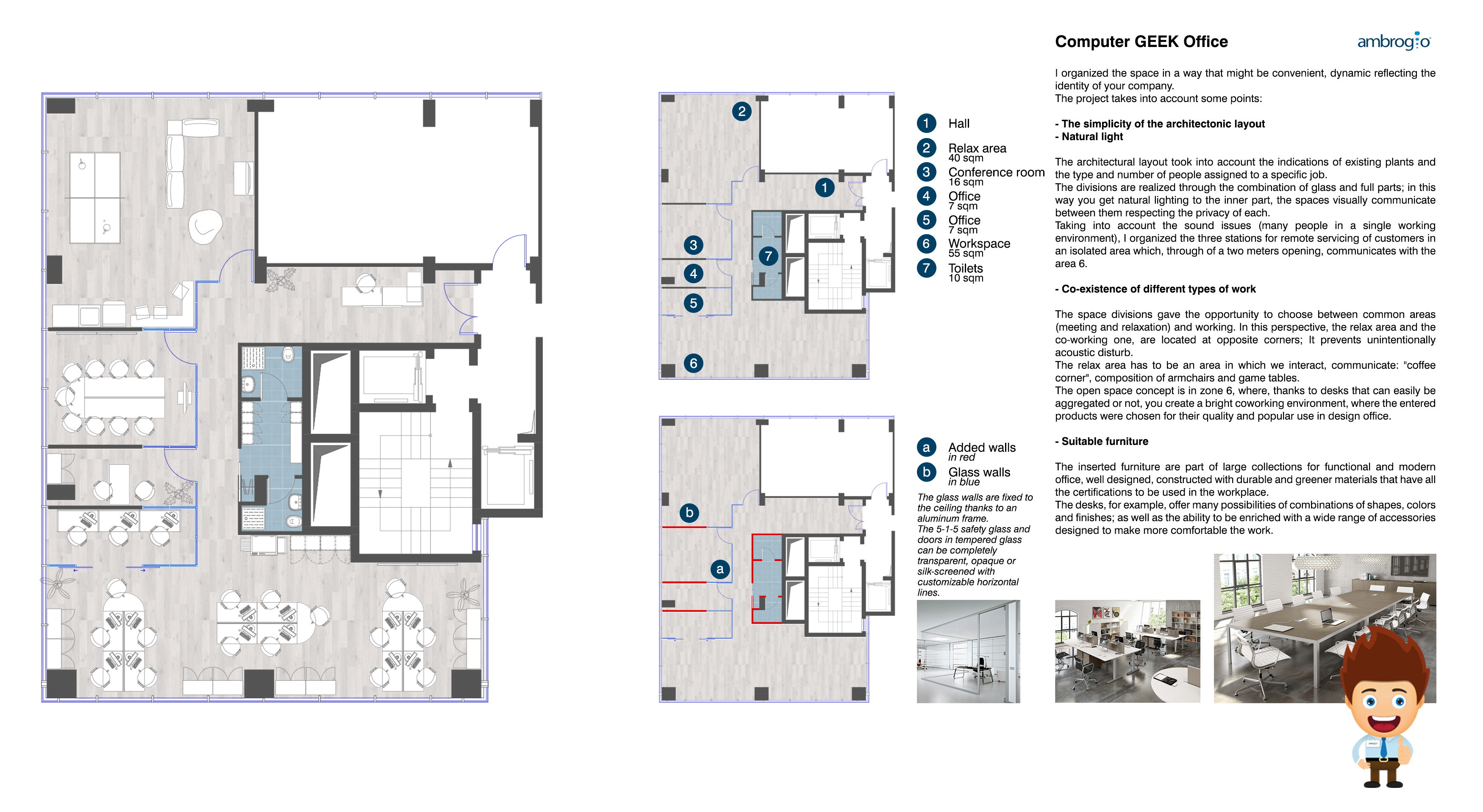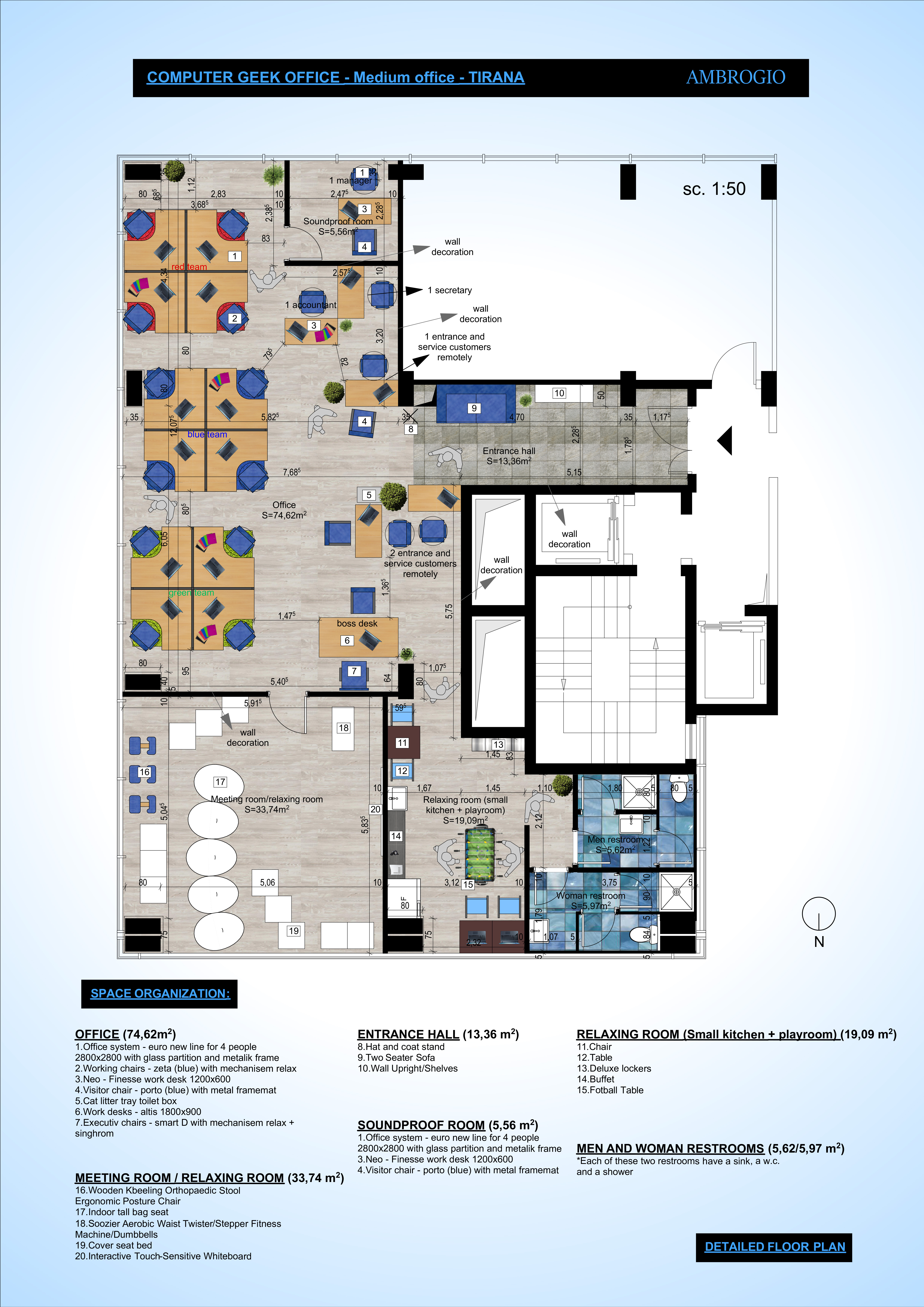 In questo ufficio lavoreranno ingegneri informatici e programmatori laureati giovani e appassionati di iOS, Android, DB, Sql, e via dicendo. Vogliamo che l'arredamento enfatizzi la gioia di fare questo grande e meraviglioso lavoro. Sarnno tutti ragazzi giovani (maschi e femmine) in età compresa tra 25 e 35 anni di profili Senior, Junior e soltanto un Project Manager di 50 anni. Produrremo software per tutto il mondo web e mobile cominciando dall'Italia, poi l'Albania stessa e quindi il resto di Europa.