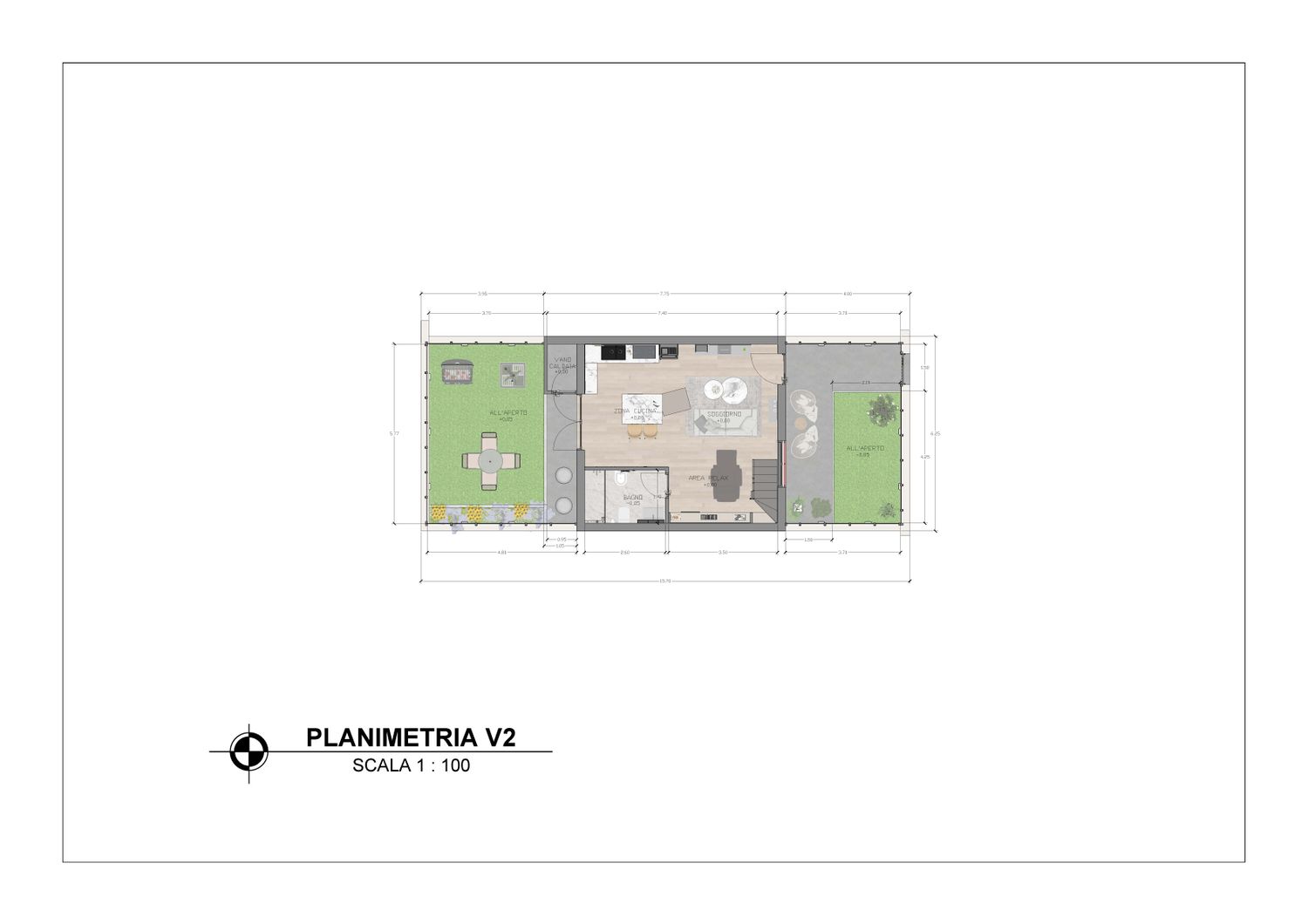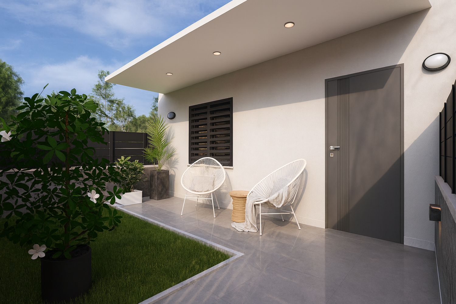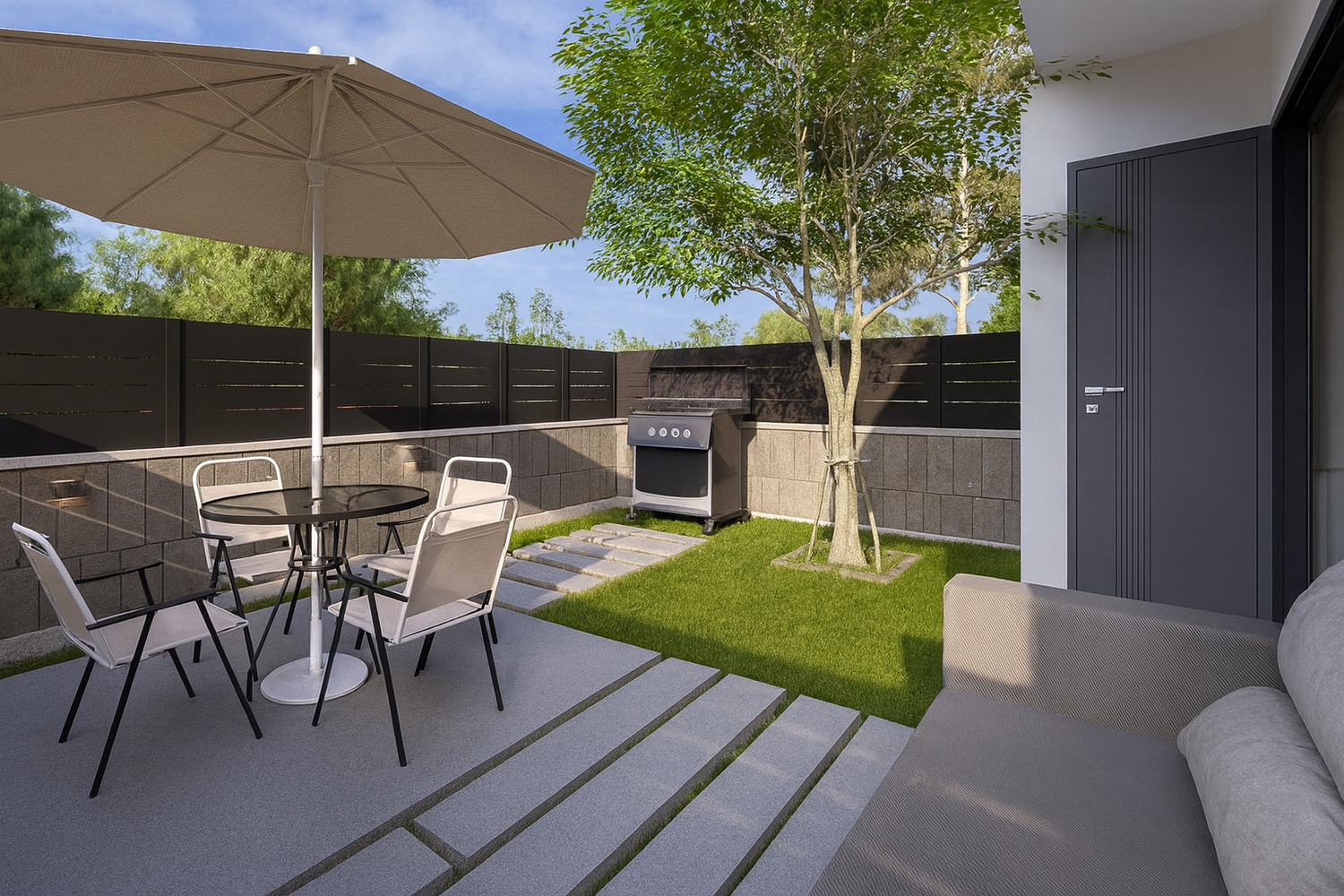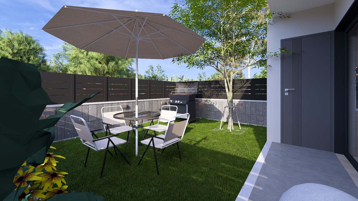 Opzione Due: Offre un approccio più compatto ed efficiente, con sedie a sdraio e un mobile a muro sotto le scale per ulteriore spazio di archiviazione. L'isola cucina rimane funzionale, con un tavolo pieghevole che può essere convertito in tavolo da pranzo all'occorrenza. L'area esterna è più naturale, con sedute in pietra, un barbecue, un'area verde con vegetazione caratteristica e un'illuminazione a parete che crea un'atmosfera calda di notte.