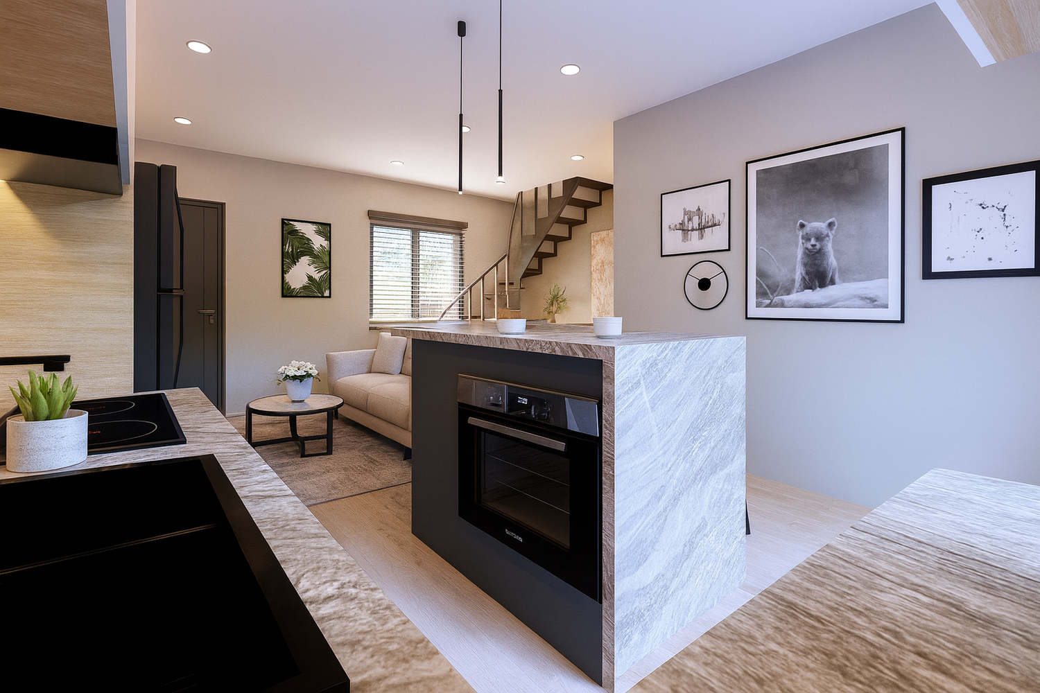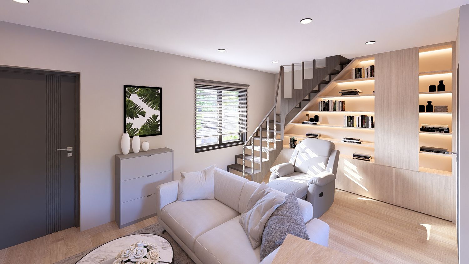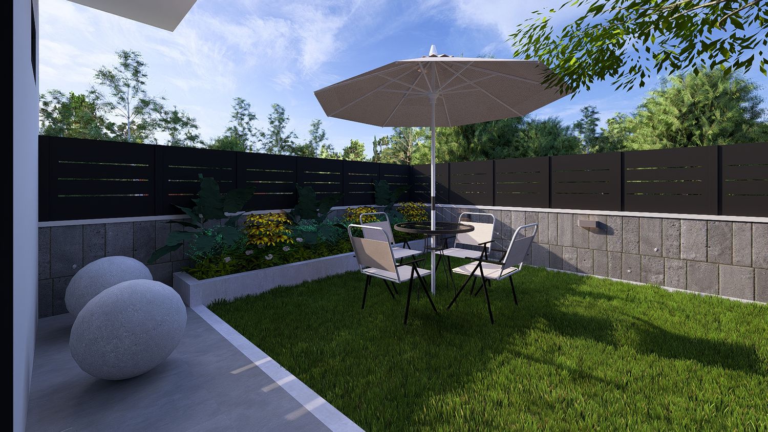Opzione Due: Offre un approccio più compatto ed efficiente, con sedie a sdraio e un mobile a muro sotto le scale per ulteriore spazio di archiviazione. L'isola cucina rimane funzionale, con un tavolo pieghevole che può essere convertito in tavolo da pranzo all'occorrenza. L'area esterna è più naturale, con sedute in pietra, un barbecue, un'area verde con vegetazione caratteristica e un'illuminazione a parete che crea un'atmosfera calda di notte.