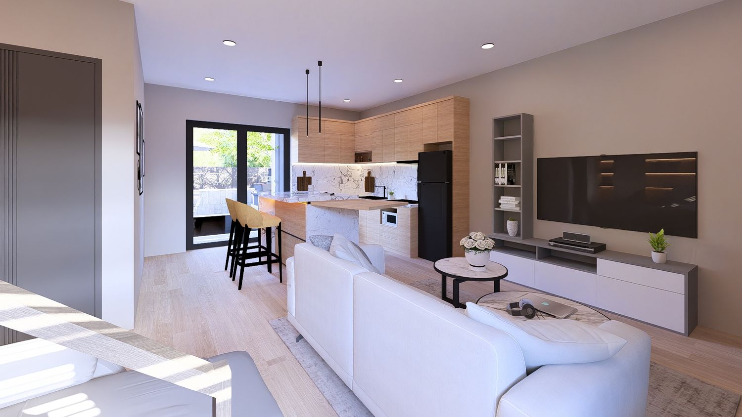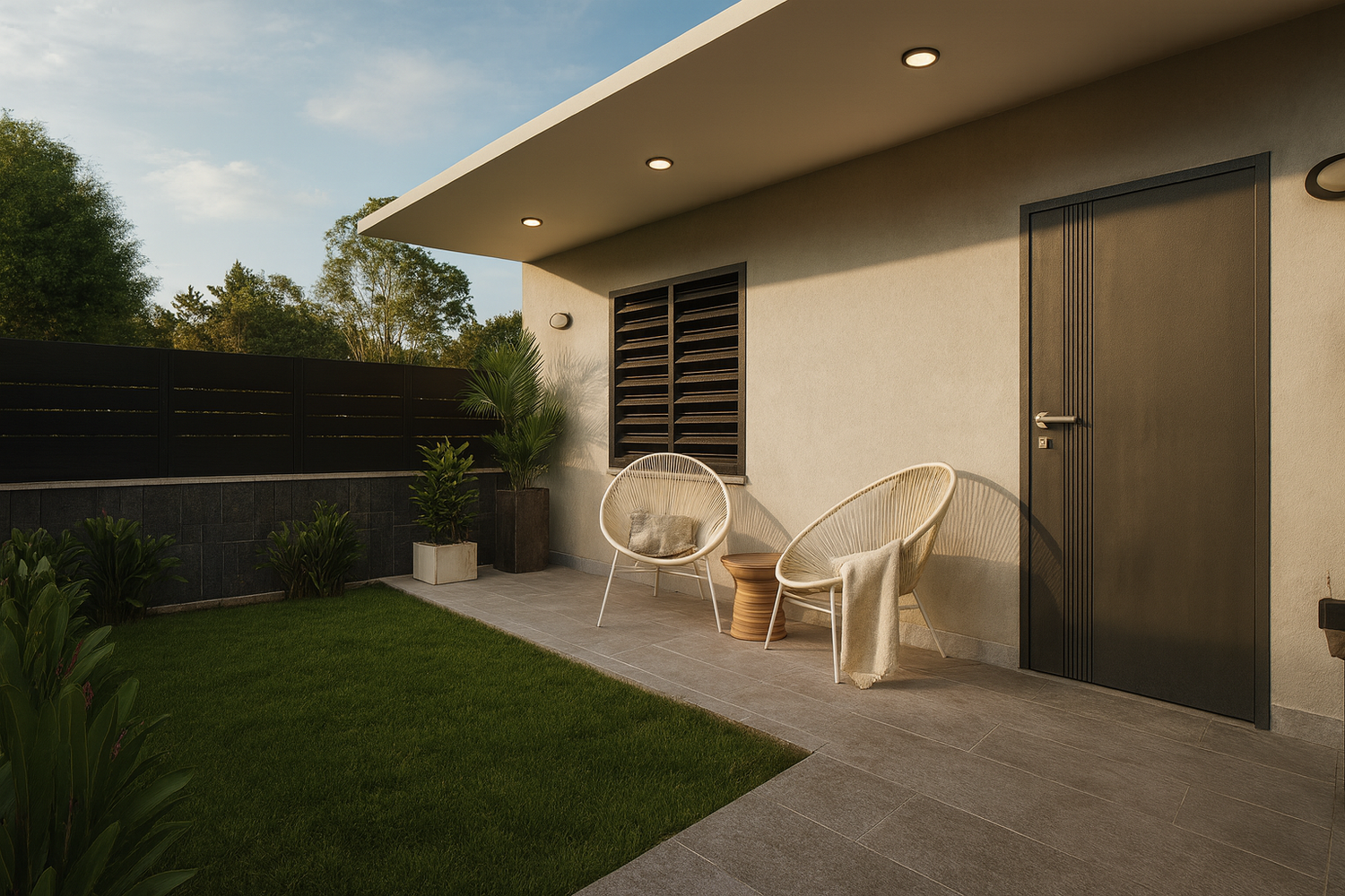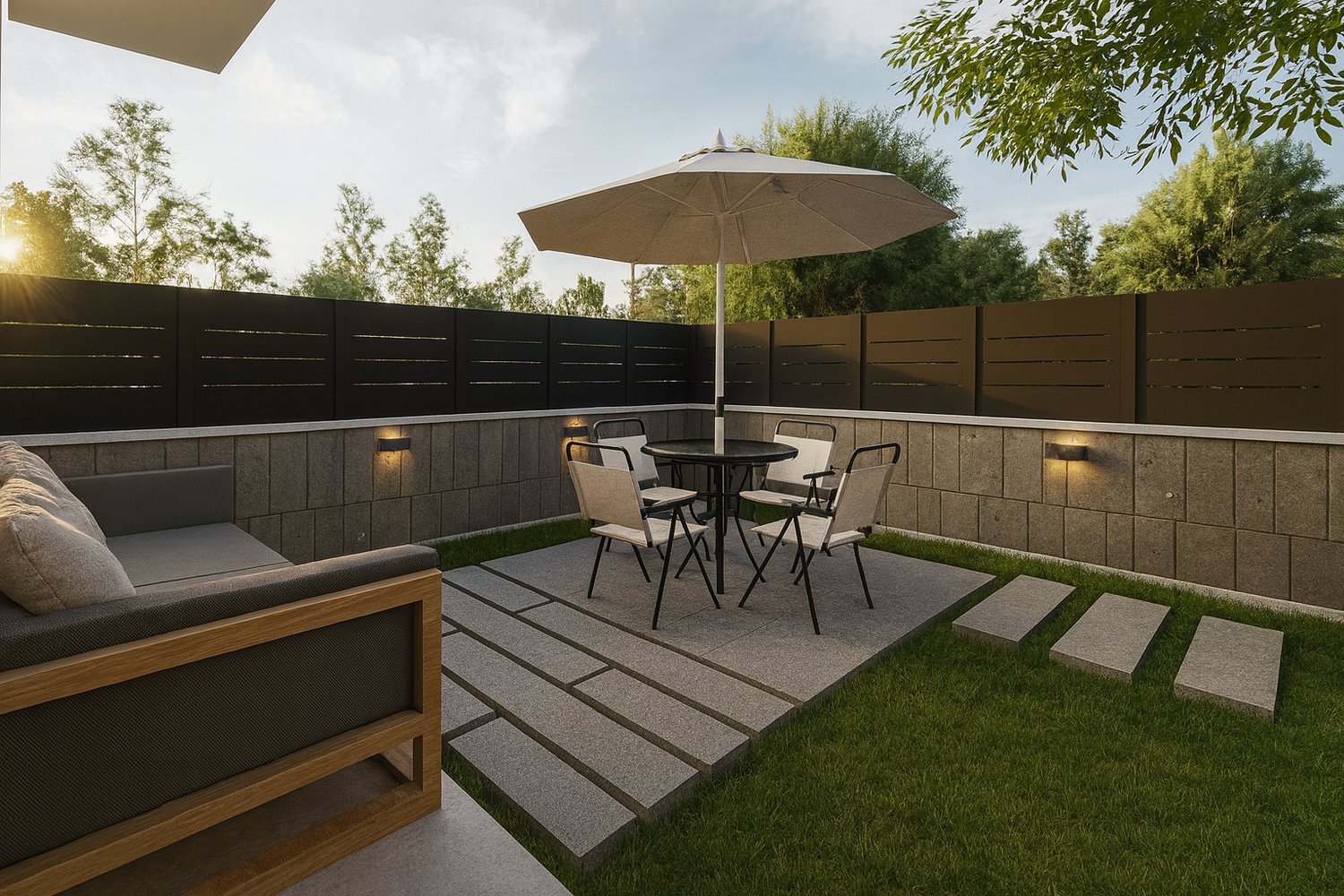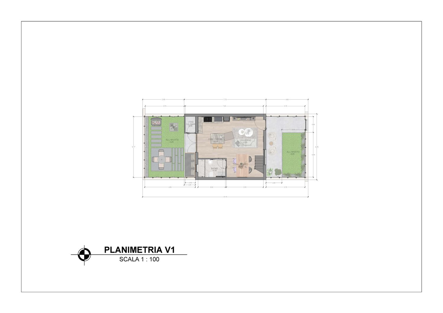 Opzione Due: Offre un approccio più compatto ed efficiente, con sedie a sdraio e un mobile a muro sotto le scale per ulteriore spazio di archiviazione. L'isola cucina rimane funzionale, con un tavolo pieghevole che può essere convertito in tavolo da pranzo all'occorrenza. L'area esterna è più naturale, con sedute in pietra, un barbecue, un'area verde con vegetazione caratteristica e un'illuminazione a parete che crea un'atmosfera calda di notte.