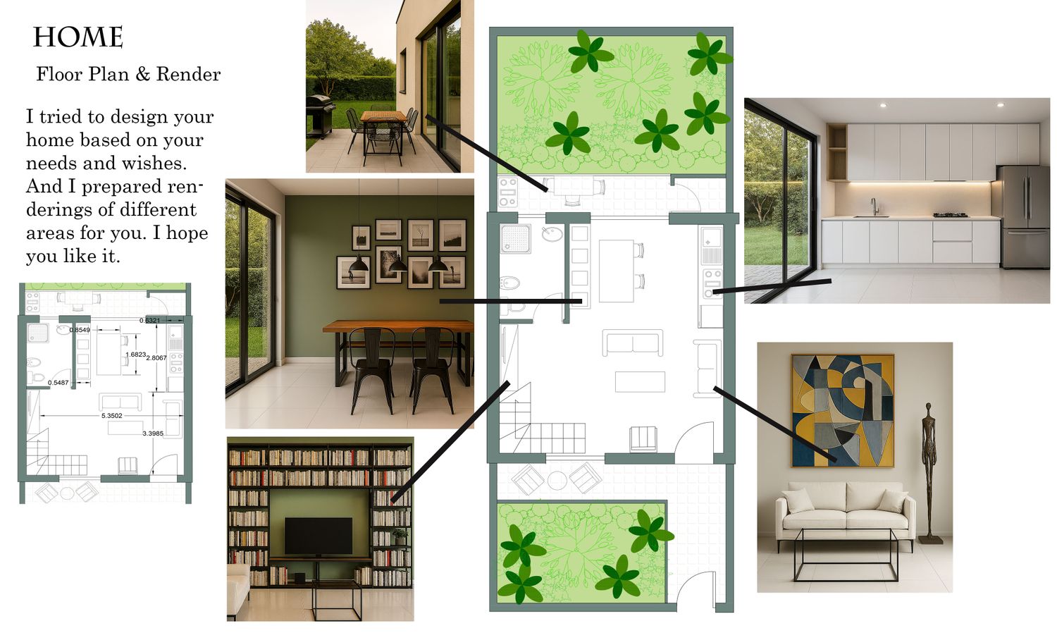 I tried to design your home based on your needs and wishes. And I prepared renderings of different areas for you. I hope you like it.