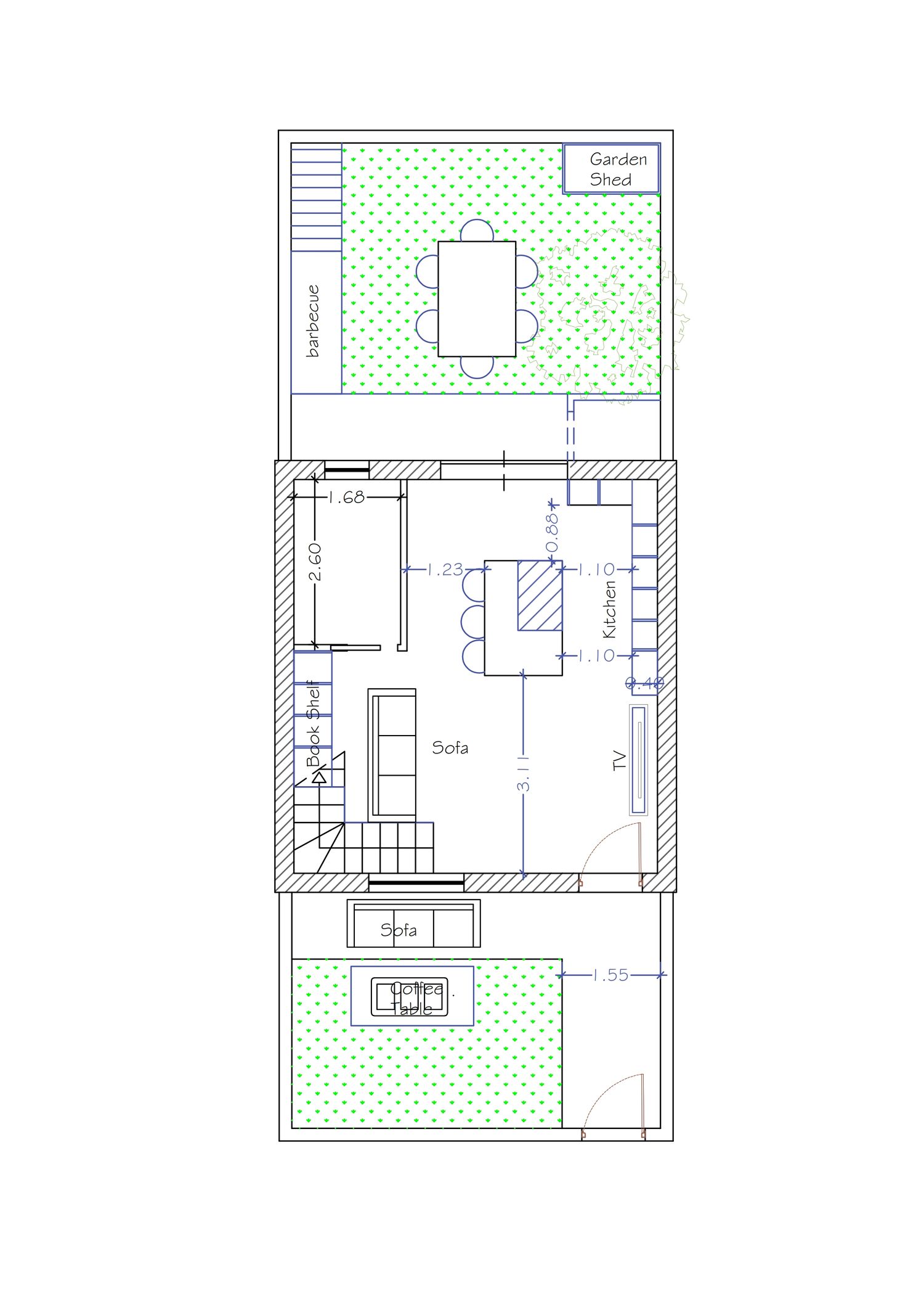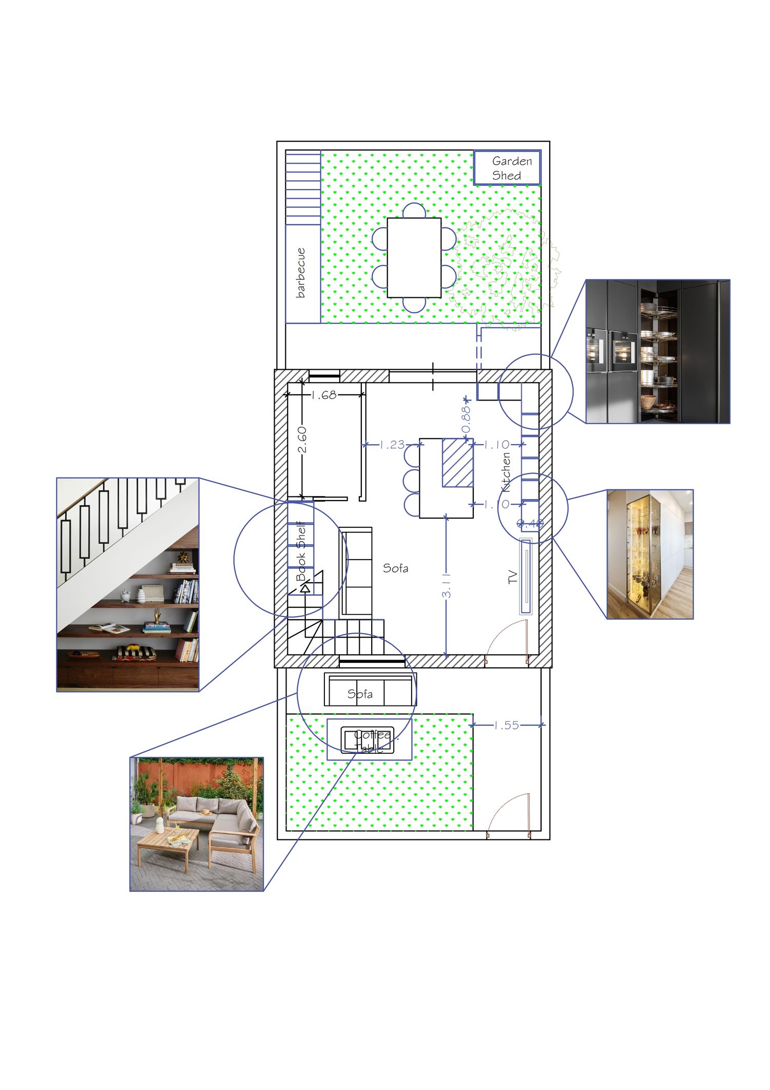 Hello, Here is my design proposal for your project. The 30 sqm open space has been organized in a functional and modern way, following your requests: The kitchen is placed in the indicated ANG. COTT. area, with a central island and seating for dining and social interaction. In front of the kitchen, along the 3.9 m wall, I positioned the TV unit with an L-shaped sofa with chaise lounge, creating a comfortable living corner. A console-type dining table has been included to optimize space while keeping flexibility. The entrance outdoor area is designed with a sofa and armchairs around a coffee table, while the outdoor area behind the kitchen includes a dining table, barbecue, and a small garden shed for storage. The overall style is modern and minimal, with clean lines and a practical use of space. This solution balances comfort and functionality, making the most of both indoor and outdoor areas.