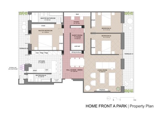 The external machine should be positioned on the courtyard side, and the internal machine in the space between the main bathroom and the corridor.