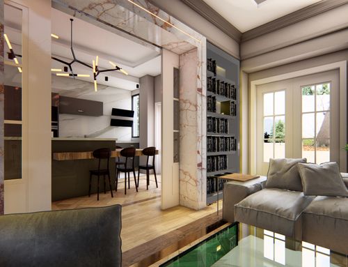 We had thought of a living room communicating with the kitchen and its larger side divisible into two with sliding doors, made of glass, almost the whole wall height.