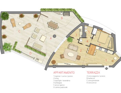 The aim is to create a warm environment, comfortable and rich in design, to enhance the value of the big terrace, with an affordable figure