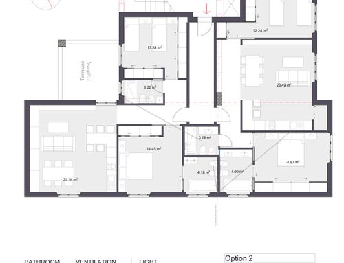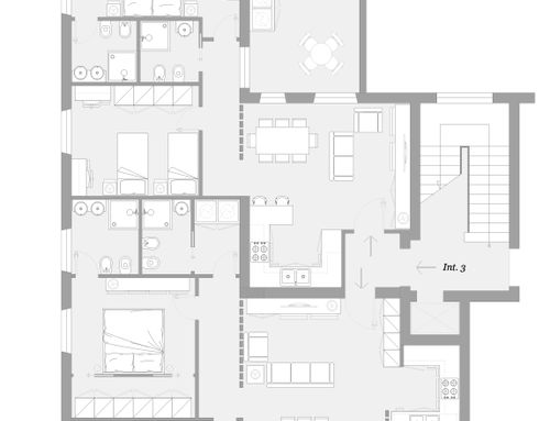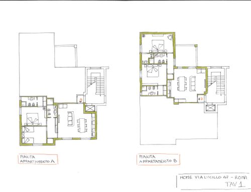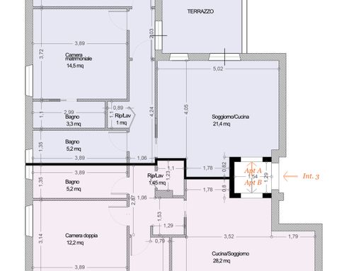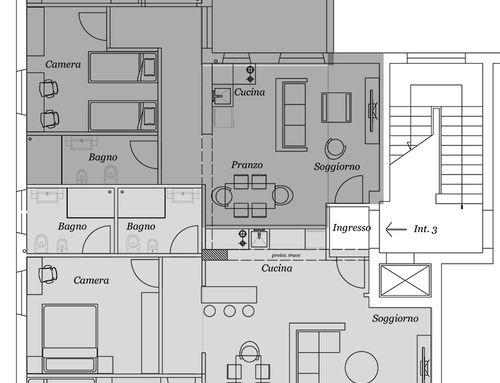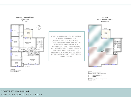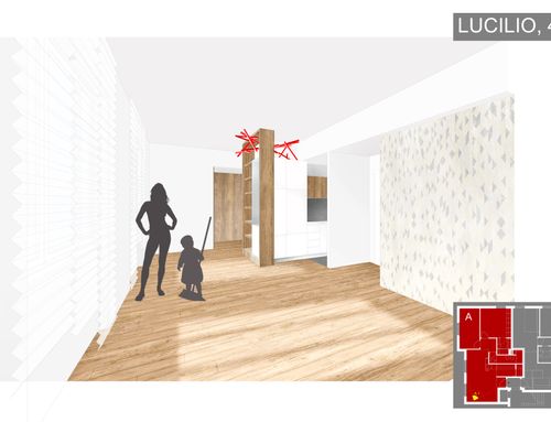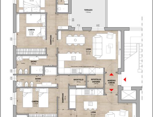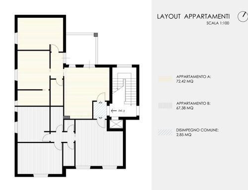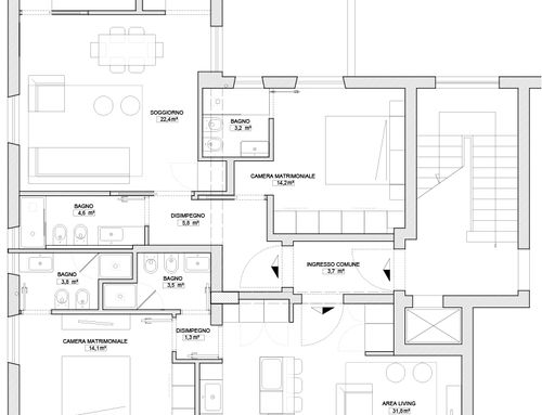 In corrispondenza dell'attuale ingresso, all'interno della superficie dell'appartamento, si dovrà prevedere un disimpegno comune per l'accesso ai due appartamenti da realizzare.