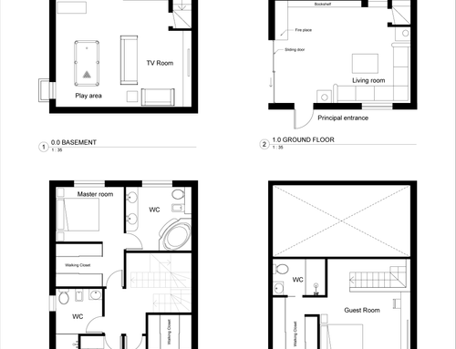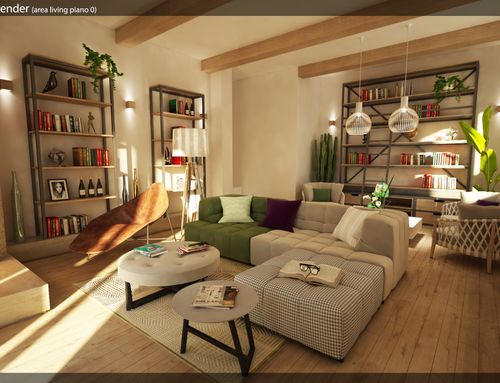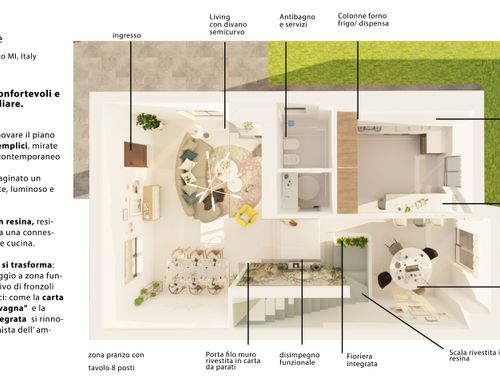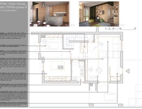 Il livello 0 si apre con un ampio soggiorno. Vorremmo rendere questo soggiorno molto accogliente, sfruttando il camino, magari con una copertura adeguata e inserendo la TV sopra di esso. Il pavimento dovrebbe essere in parquet, molto resistente perché conduce direttamente attraverso la porta d'ingresso e all'esterno c'è un giardino. Dal soggiorno si accede attraverso una scala di tre gradini ad una grande area che ha un bagno alla sua sinistra, per essere valorizzata e ottimizzata perché sarà la più utilizzata, anche dagli ospiti.