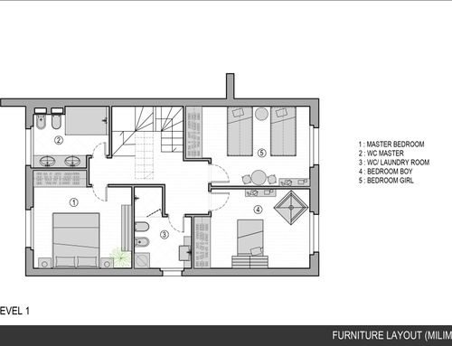 One will be dedicated to the two 3 year old twins, the other to the 5 year old child and the last one will be the parents' bedroom. The bathroom has a large window and a large bathtub. We would like to have a bathroom where we can relax with a comfortable bathtub, maybe a square one, and think about a sanitary arrangement that enhances its potential. It would be nice to have a double sink.