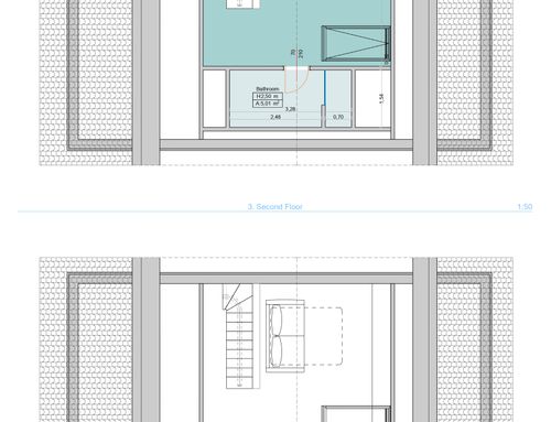 Infine, accediamo al sottotetto attraverso una scala a chiocciola. L'area sarĂ dedicata agli ospiti. Quindi dovrĂ avere un bagno speciale e dovrĂ essere razionalizzato per sfruttare al meglio lo spazio disponibile.