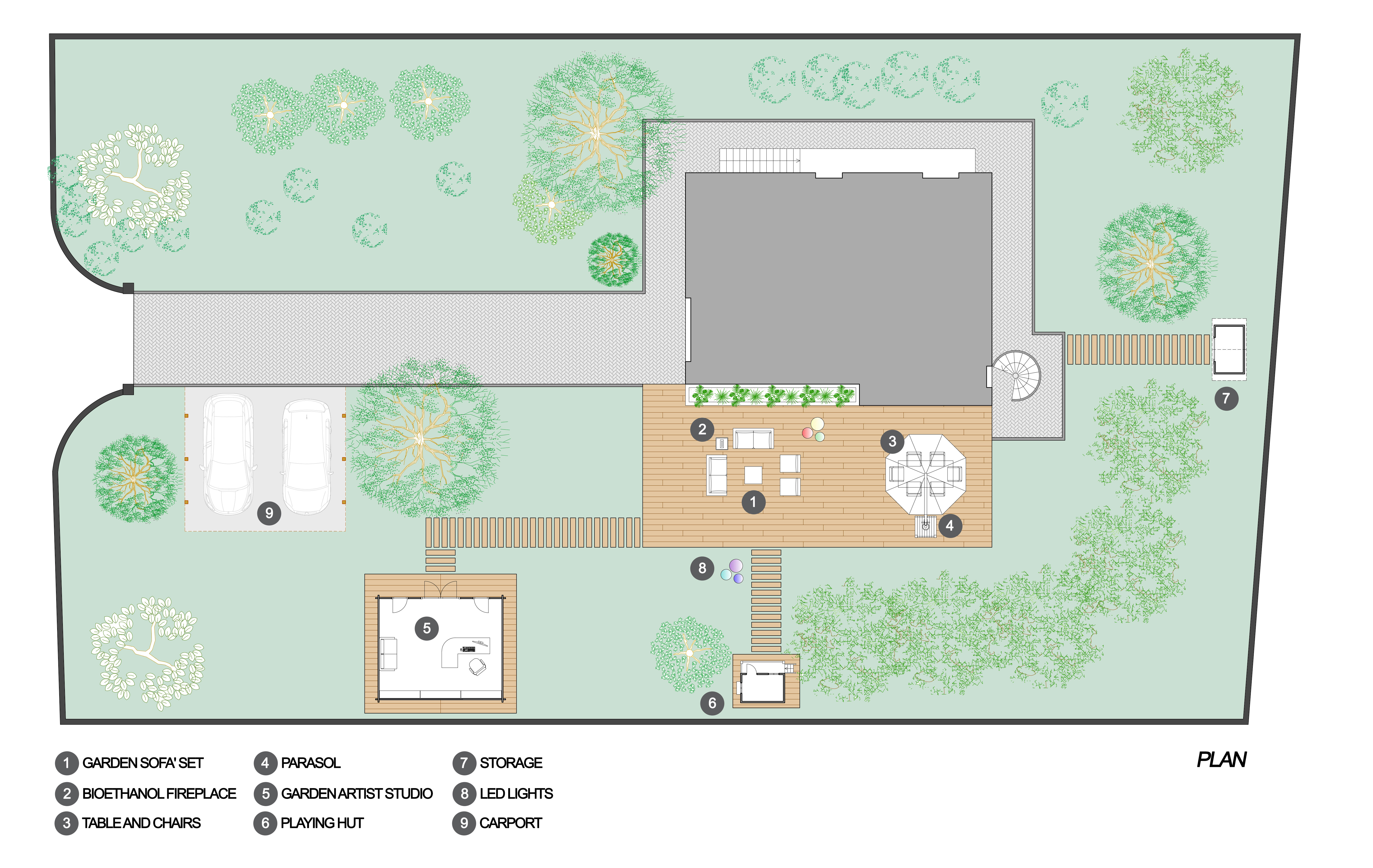 - Create a terrace space for eating and relaxing, close to the stairs leading to the kitchen and living room (right side of the house), in a very warm and cosy atmosphere (see reference pictures), i.e. not in a cold design magazine way