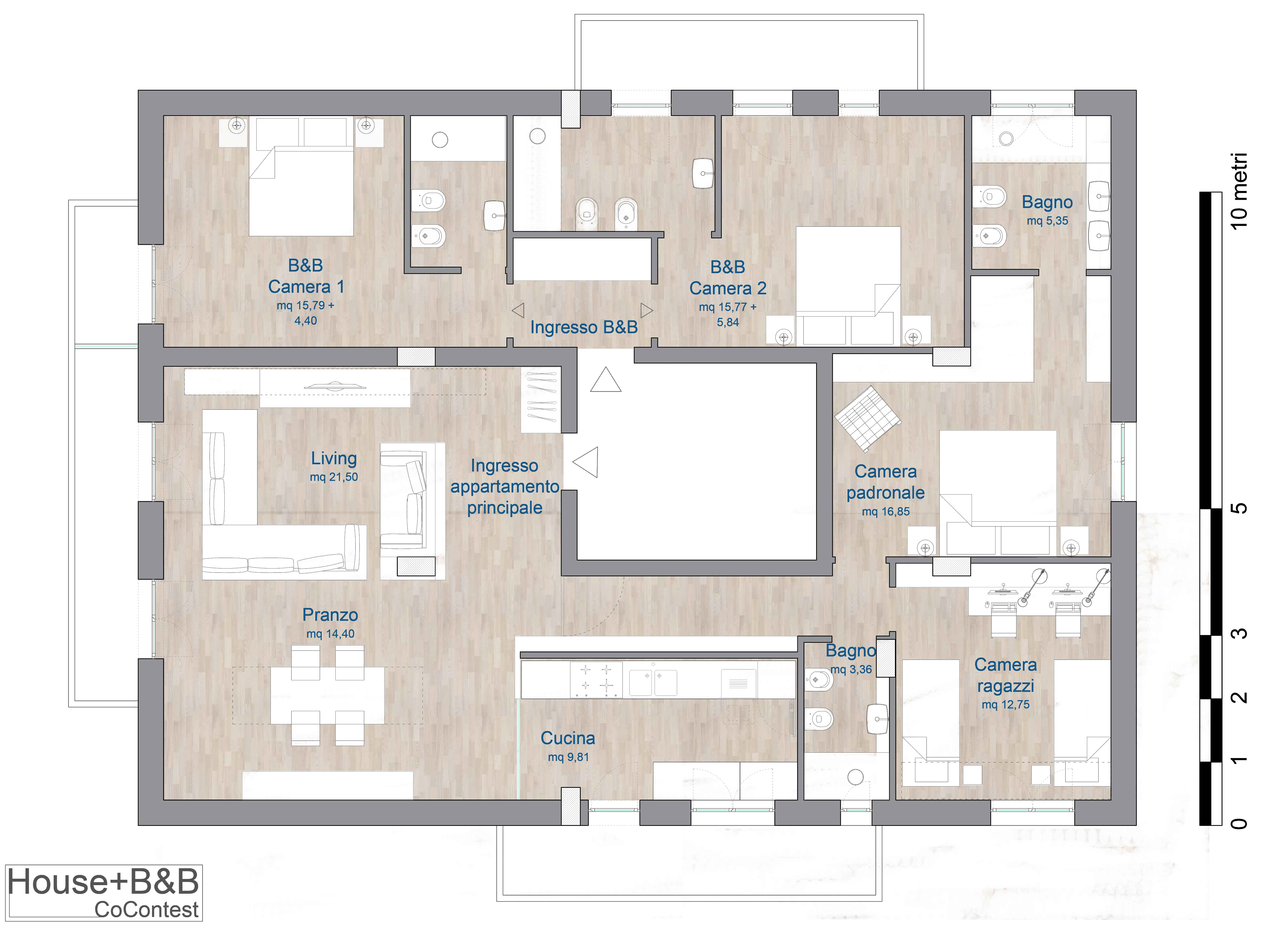 In the new house we would obtain similar spaciousness and centrality of the living area. We would also obtain, in addition, two more double bedrooms, each with bathroom, to use as a bed and breakfast