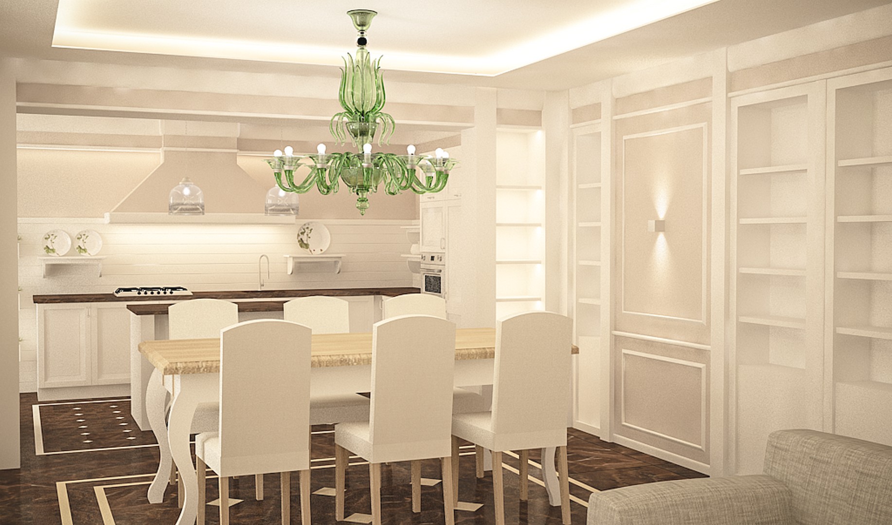 Per luci vorrei un abbassamento del soffitto necessario per montare i faretti a led ed una gola luminosa con dei led a nastro. Tre bei lampadari stile vetro di Murano a soffitto. Due in salone, uno sopra la zona del divano, uno sopra la zona del tavolo ed un altro in cucina.