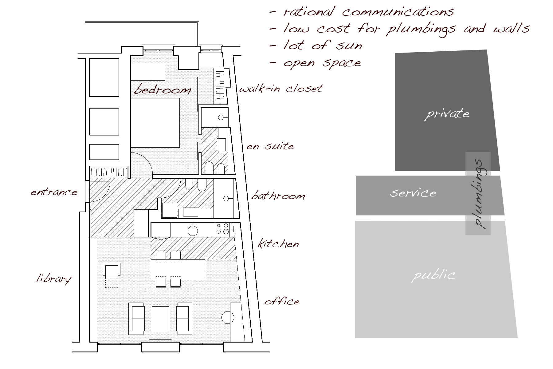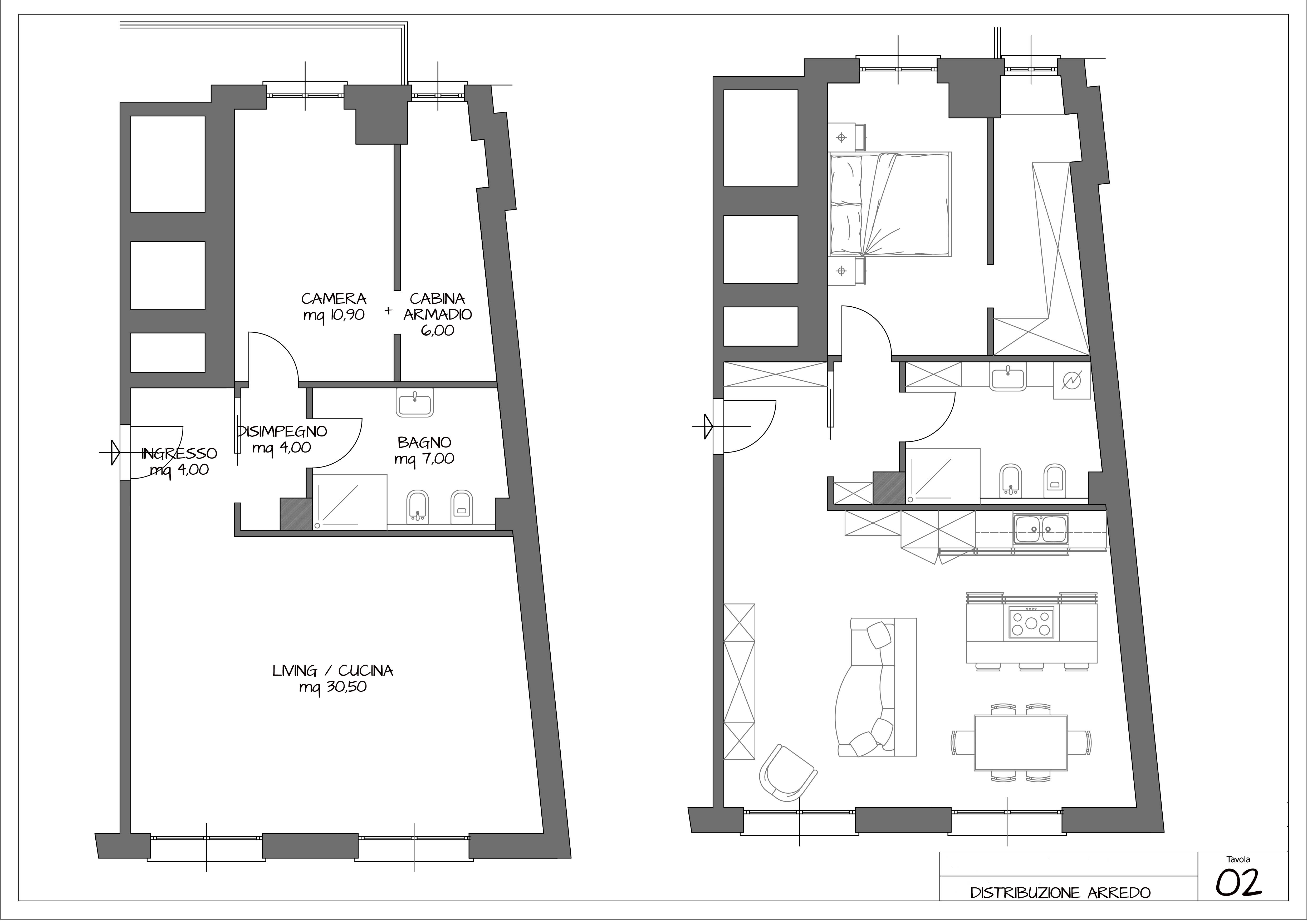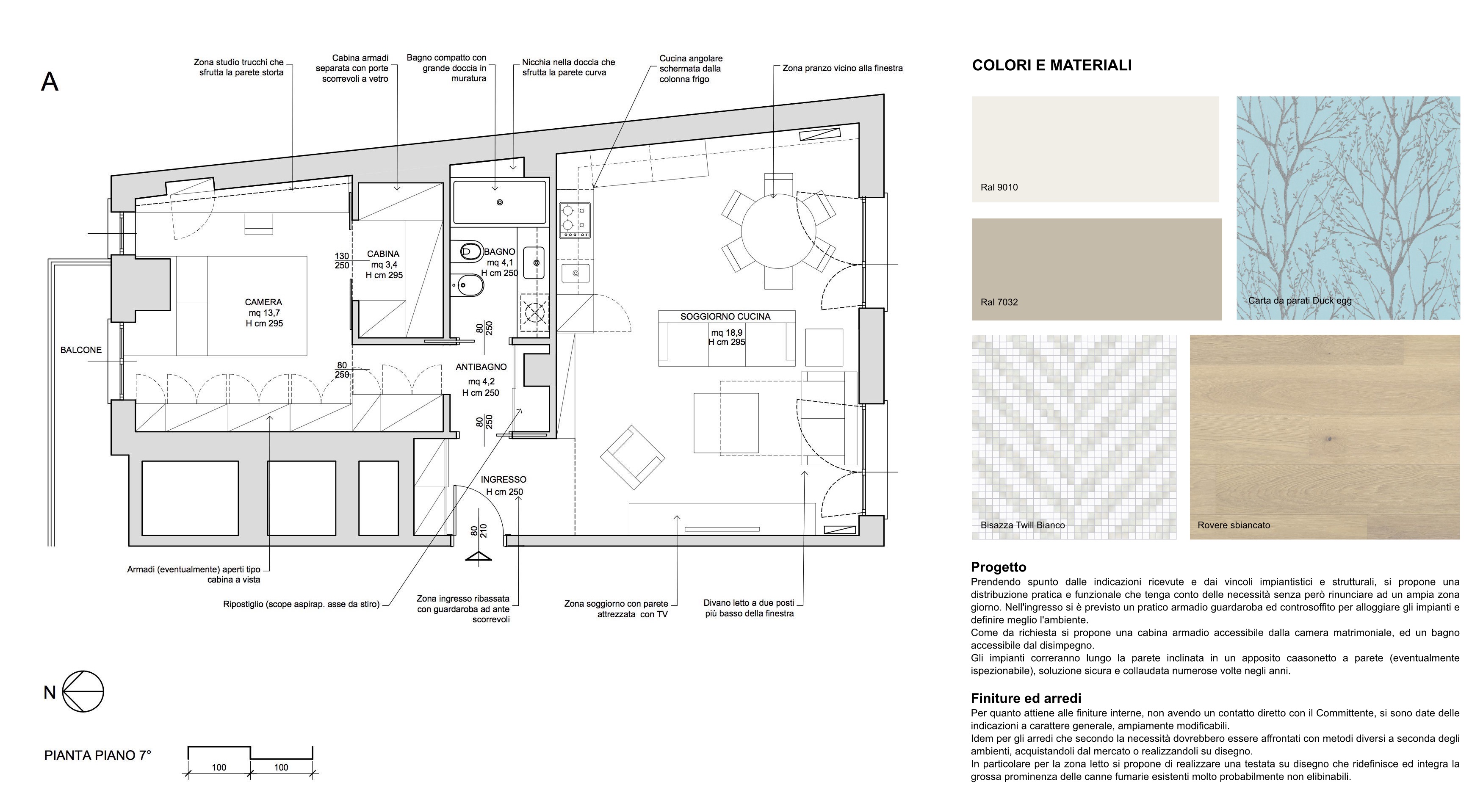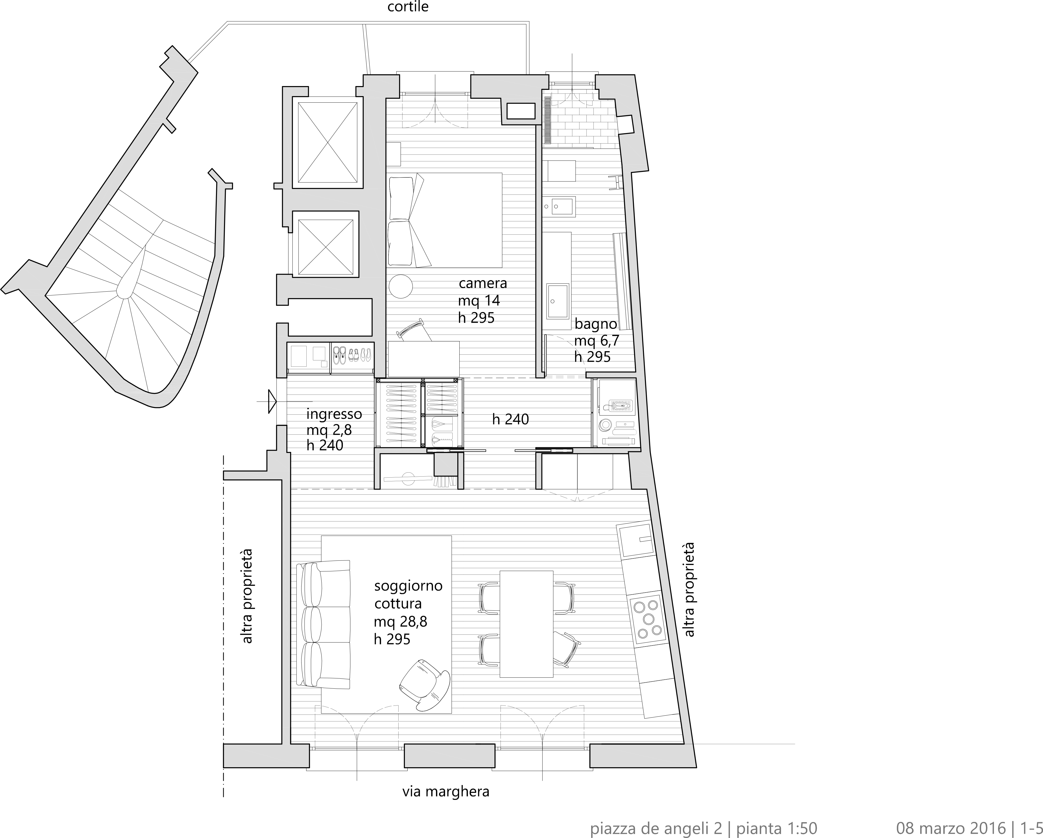 Desidero completamente rifare l'appartamento sia come taglio che come finiture. In questa fase vorrei avere idee sulla disposizione interna. Vorrei avere un ampia zona living con cucina a vista sul fronte via Marghera.