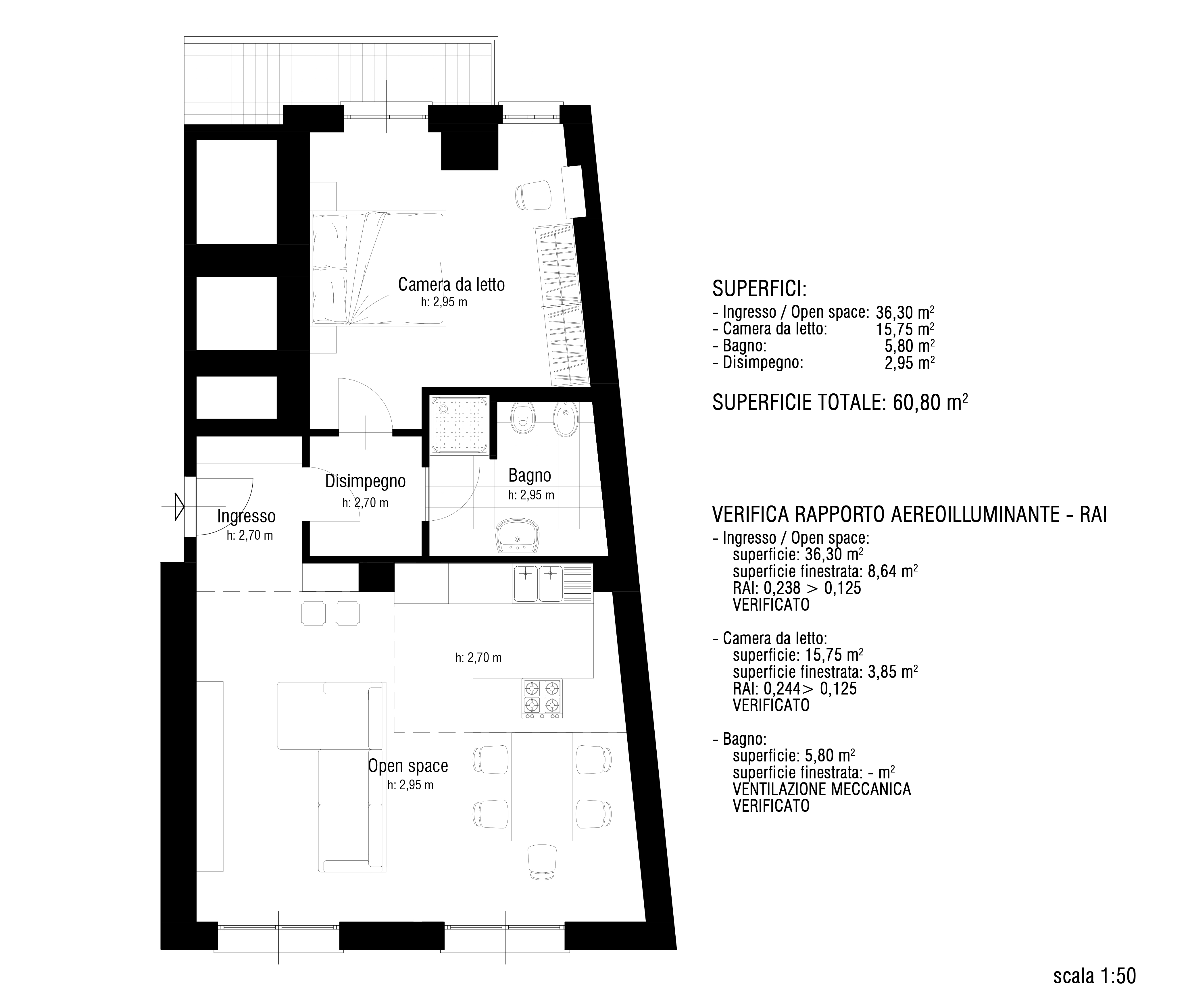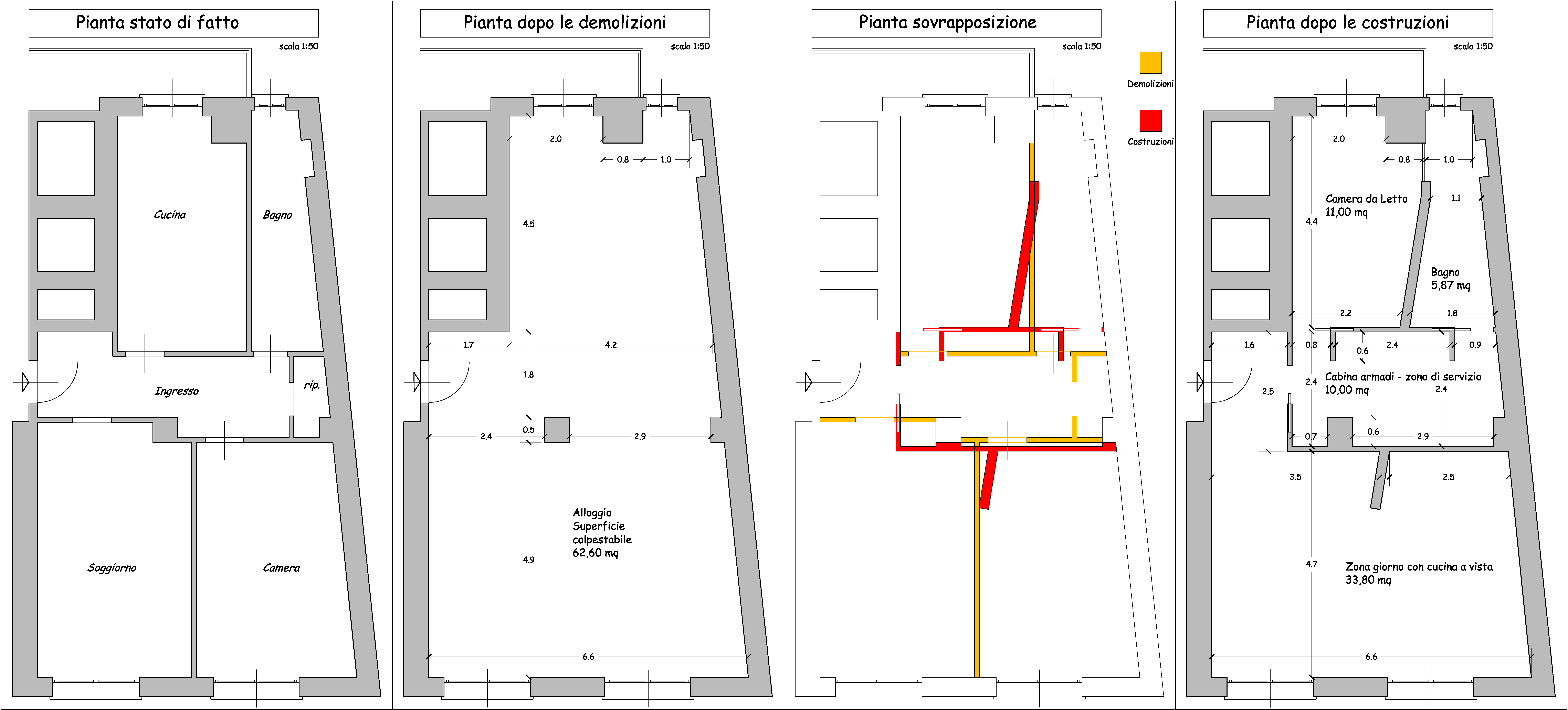 L'appartamento è molto vecchio nel taglio e nelle finiture. Dalla piantina catastale si vede entrando a destra piccolo soggiorno, di fianco sulla via trafficata la camera da letto, sul retro una cucina grande e un bagno stretto e piccolo.