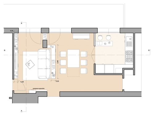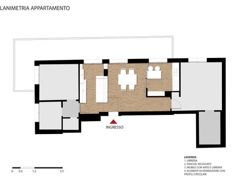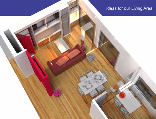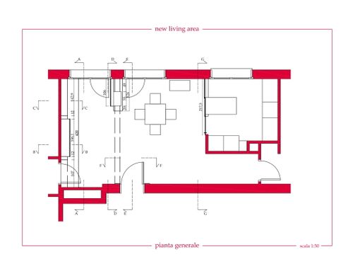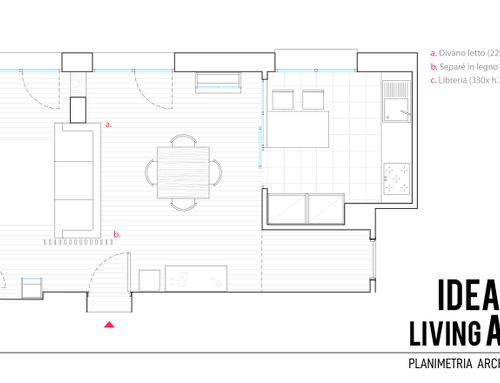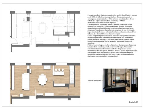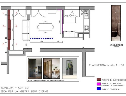 Non si prevedono interventi al pavimento (parquet rovere) nè alle porte o finestre esistenti. Il colore del muro sarà un off-white e sarà presente un divano 3 posti senza penisola di colore "lampone" da sistemare affianco alla colonna.