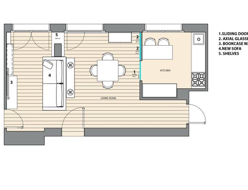 The floor (oak parquet), the existing doors and windows will remain as they are. The color of the wall will be an off-white and there will be a simple 3 seater sofa (without penisula) color "raspberry". It will be placed next to the column.