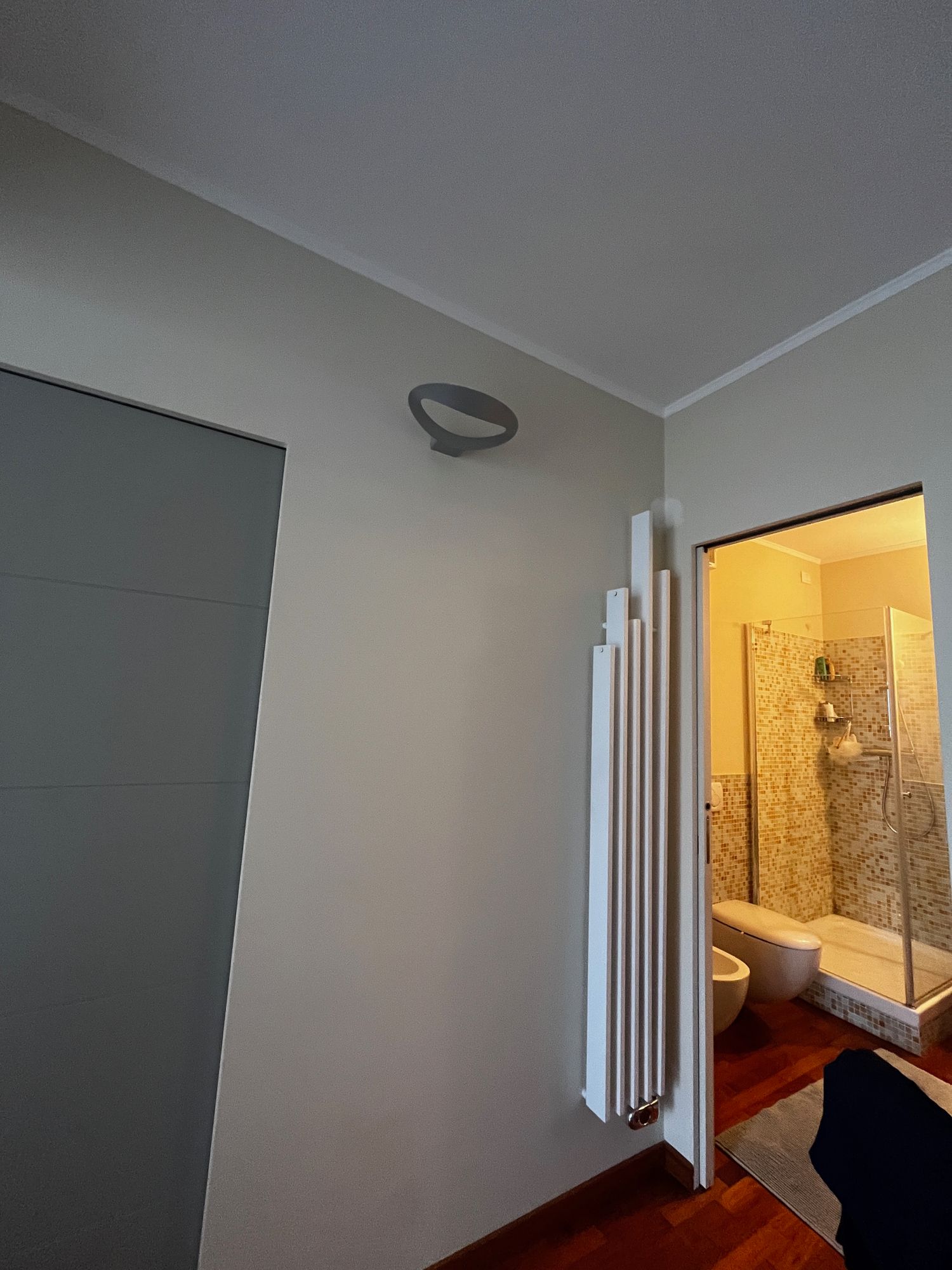 La porta che apre sulla camera è grigia , mentre c'è un'altra porta scorrevole nel muro che apre su un bagno en suite , dello stesso colore della parete .... di fianco termosifone bianco