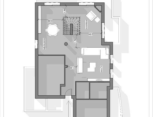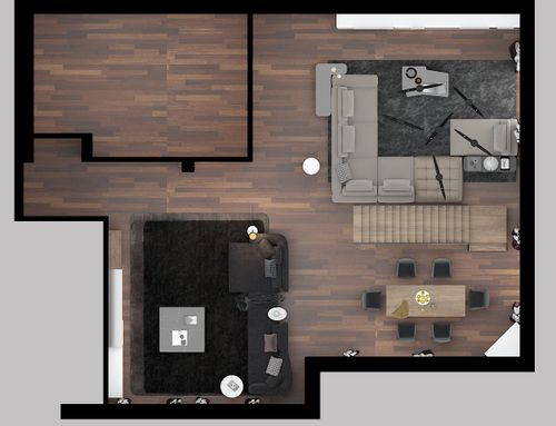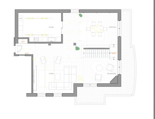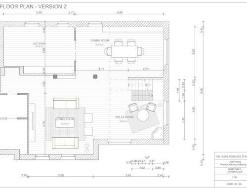I would like your suggestions on how to redesign the living of my new two storey attic. A portion of the living has standard ceiling height (2.70m) while another one (striped on the floorplan)  has double high ceiling (from 5.60m going down to 4.00m on the side of the two big window). The main point is the stairs connecting to second floor.  I do not like the existing one and I wish to replace it. It is placed along a wall dividing the living in two section. I am not sure this is the best solution and I would like to get your suggestions. Better to leave the wall dividing the relax zone and the dining area or better to remove the wall and place an helicoidal stair? Or remove just a portion of the wall and place a stair on both side of the wall as in the modified floorplan I attach? The stair connects to the upper level that, on the right side going up is closed, while on the left side is open looking on the living. I wish to have a 3d render to see the effect of the stair. The furniture style I like is modern and elegant, light colors (white, beige, taupe..). The windows and doors are white, the floor is wodden.