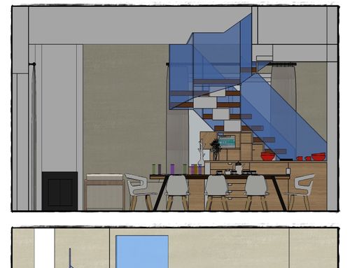 Vorrei dei suggerimenti su come arredare il living del mio nuovo appartamento, un attico su due livelli. Una parte del living ha altezza standard (2.7m) un'altra parte, tratteggiata nella piantina ha un'altezza che va da 5.60m a 4.00m nella parte delle due finestre grandi. La parte piu' critica e' la scala che porta al secondo livello. Quella esistente non mi piace e vorrei sostituirla. Corre lungo una parete che divide il soggiorno in due parti. Non sono sicura sia la soluzione migliore e vorrei i vostri suggerimenti. Meglio lasciare la parete e divedere la zona relax da quella pranzo cambiando la scala o meglio demolire la parete e mettere una scala elicoidale? Oppure demolire la parete solo in parte e fare una scala a sbalzo su entrambi i lati come nella piantina modificata che allego? La scala collega il piano superiore che nella parte salendo a destra e' chiuso mentre a sinistra e' a soppalco sul soggiorno. Vorrei un rendering 3D per vedere l'effetto della scala. Per l'arredamento mi piace uno stile moderno e raffinato, colori chiari, bianco, beige, tortora. Laccato lucido e opaco. Le finestre e le porte interne sono in legno laccato bianco, il parquet in iroko. Aspetto i vostri suggerimenti! Grazie