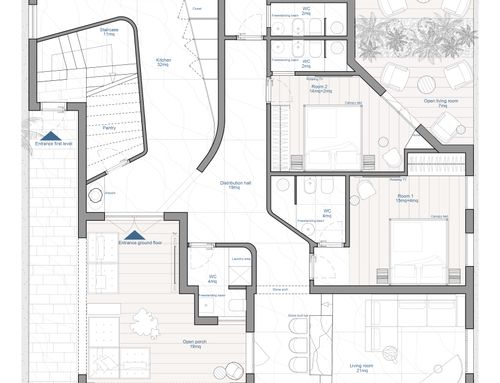 Necesito dividir la villa en dos áreas. En el piso superior, una zona de dormitorios, dos baños, cocina, sala de estar y un acceso privado desde la planta baja. En la planta baja, debo crear tres/cuatro habitaciones con baños, con un mínimo de 14 metros cuadrados por habitación, cada una con su propio acceso, una cocina y un espacio común. En la reorganización de los espacios de mi villa en la playa, me gustaría que se perciba un contraste claro con el entorno urbano y, sobre todo, un espacio limpio con pocos objetos. El ambiente debe ser sencillo y me gustaría tener uno o dos rincones "instagrammables" que la hagan especialmente reconocible en los sitios web. Me gusta el blanco y la luz, pocos elementos de colores (colores fríos como el azul) y elementos con materiales naturales (madera, bambú, ratán). Linealidad, espacios bien diseñados y practicidad. Como inspiración, pienso en las casas de las islas griegas, las residencias en las Islas Eolias o los hermosos "Trulli" de la región de Apulia.