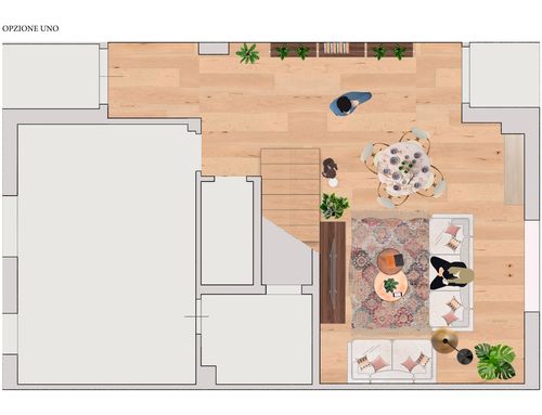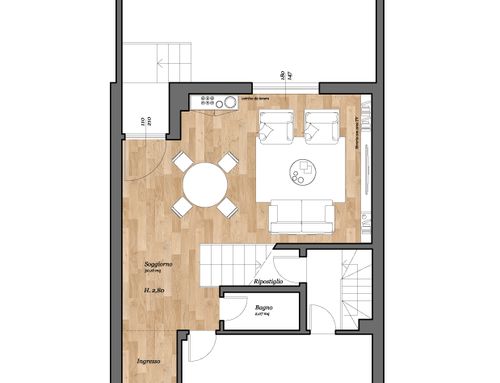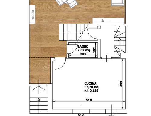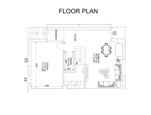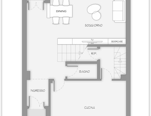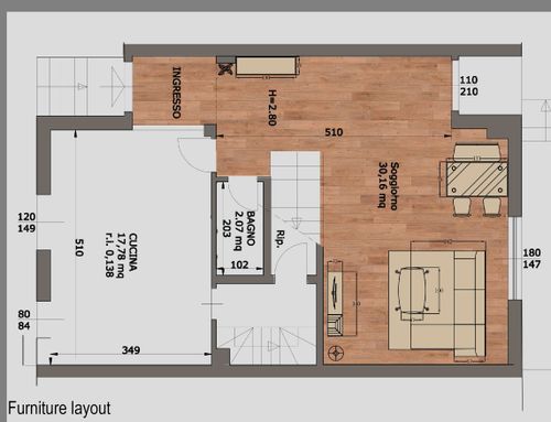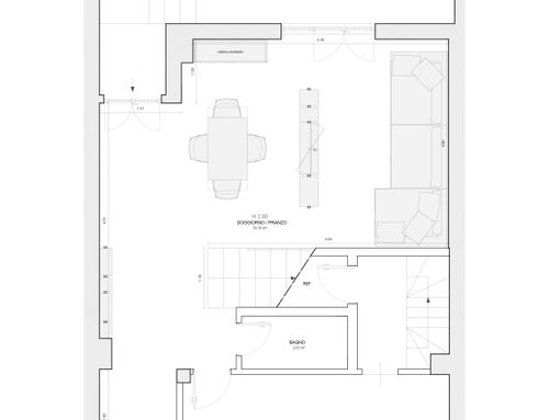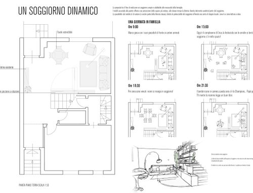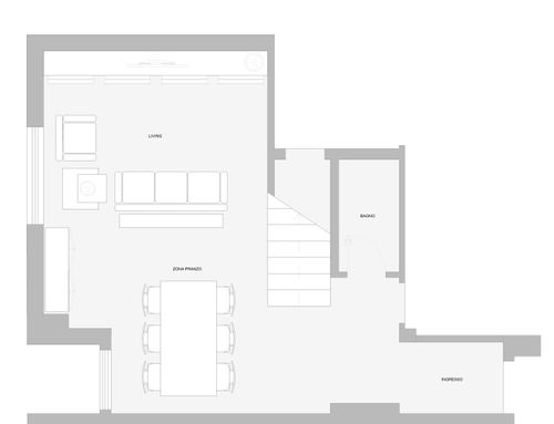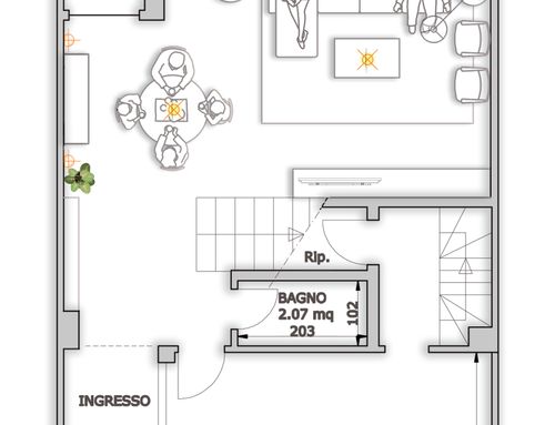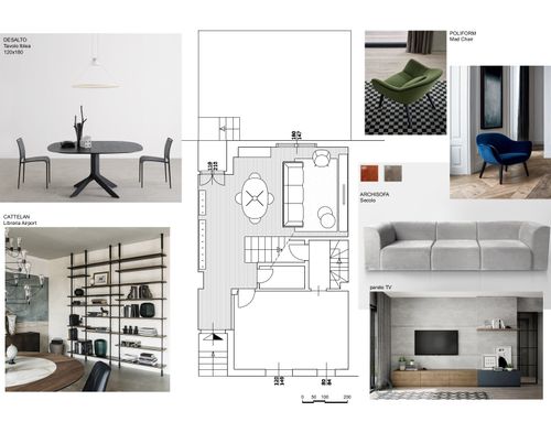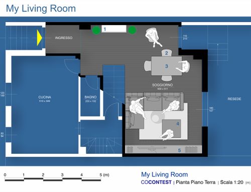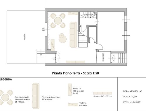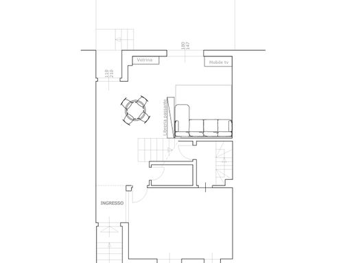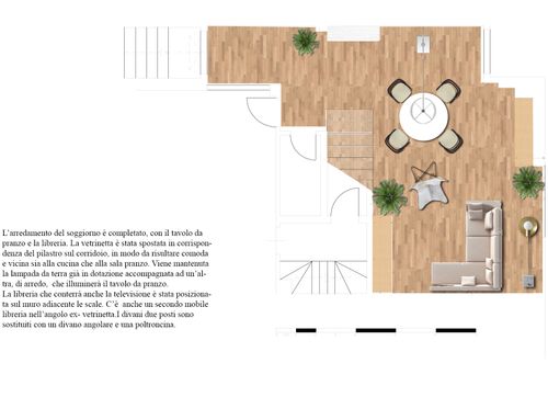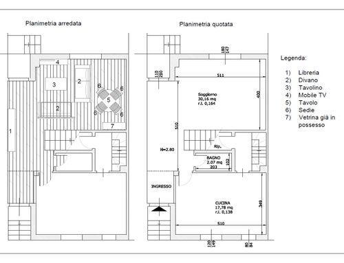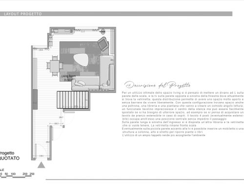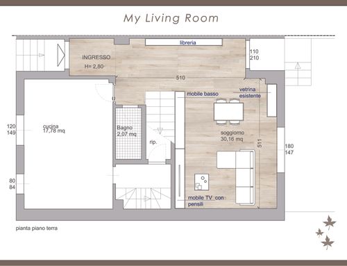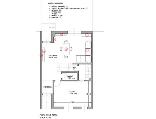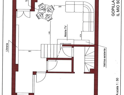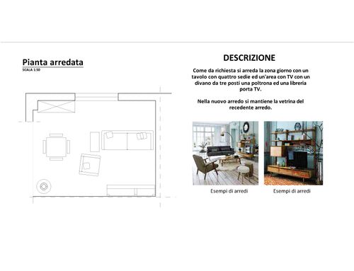 Desidero arredare la zona soggiorno tenendo conto delle seguenti esigenze: inserimento di una libreria, un tavolo con 4 sedie, zona TV con almeno 4 posti seduti e dell'attuale mobilia vorremmo mantenere la vetrina. Gli attuali punti luce per la TV possono essere spostati.