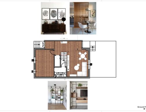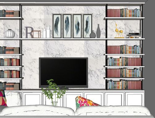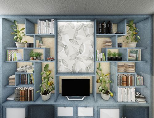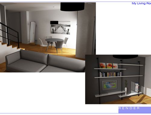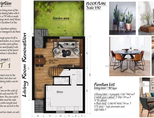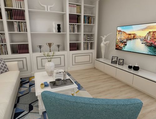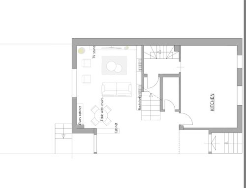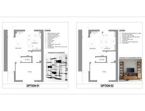 I would like to furnish the living area taking into account the following needs: a bookcase, a table with 4 chairs, a TV area with at least 4 seats and of the current furniture we would like to keep the glass cabinet. The current TV lighting points can be moved.
