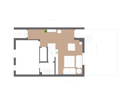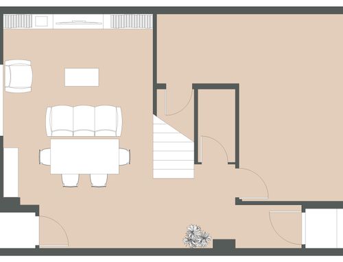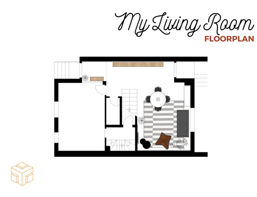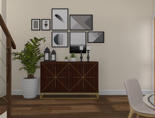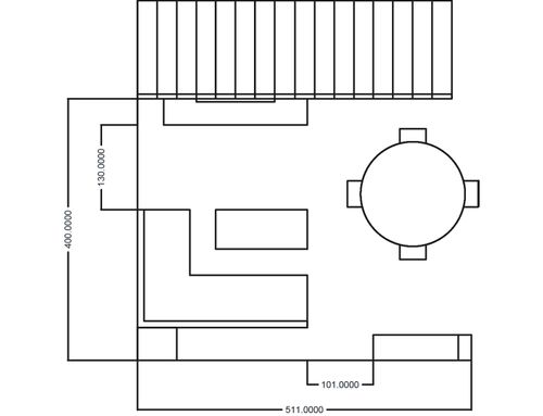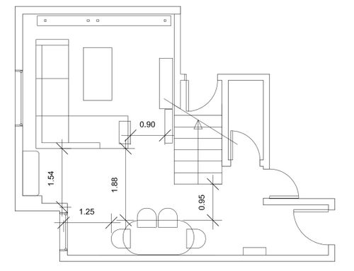 Me gustaría amueblar la sala de estar teniendo en cuenta las siguientes necesidades: una estantería, una mesa con 4 sillas, un área de TV con al menos 4 asientos y de los muebles actuales nos gustaría mantener el gabinete de vidrio. Los puntos de iluminación de TV actuales se pueden mover.
