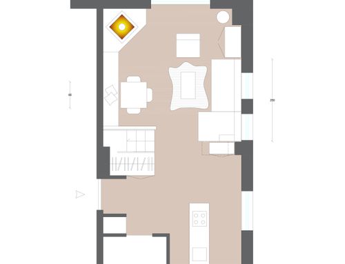 We would like to have ideas about optimizing the furnishings around the sofa, the dining table, the hall, and in the kitchen.