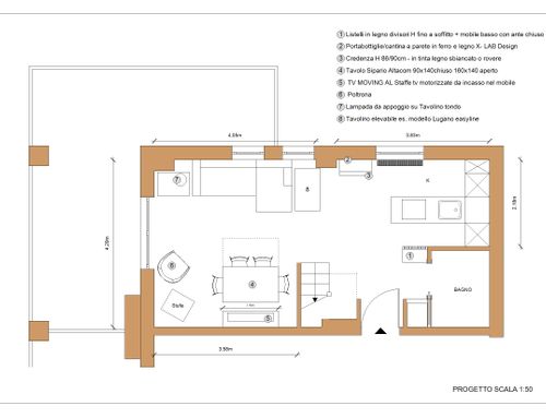Vorremmo avere idee circa l'ottimizzazione degli arredi intorno al divano, al tavolo da pranzo, all’ingresso, e in cucina.