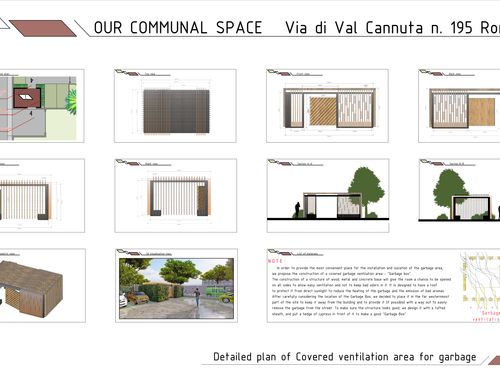 IT IS A CONDOMINIUM EQUIPPED WITH A LARGE COURTYARD, ABOUT 500/600 SQM, WITH PLANTS AND TREES. A PART OF THIS COURTYARD WHICH IS ALMOST L-SHAPED, THERE IS A PARKING AREA IN WHICH APPROXIMATELY 16 BUCKET BUCKETS ARE LOCATED. THESE ARE EXACTLY UNDER THE BALCONIES OF ONE SIDE OF THE BUILDING CREATING PROBLEMS OF SMELLS, MOSQUITOES, MOSES, MICE AND MUCH MORE AND MORE AND, BECAUSE THIS SPACE IS LOCATED OWN AT THE MAIN ENTRANCE OF THE CONDOMINIUM, THE AESTHETIC APPEARANCE IS DEMORIZING. THE OBJECTIVE OF THE CONDOMINIUM IS TO FIND A DEDICATED SPACE AND SOME NICE COVERAGE THAT HIDES THAT INDECENT VIEW.