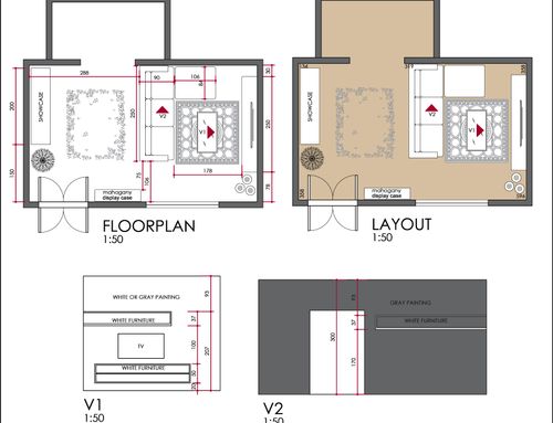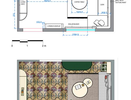 - a long piece of furniture (length 250 cm, depth 50 cm, height 90 cm) and a showcase from the 60s (length 200 cm, depth 50 cm): they are family furniture that I would like to keep, but not if it must become a Kitsch style, which possibly we could also change color like a decapè (pictured)