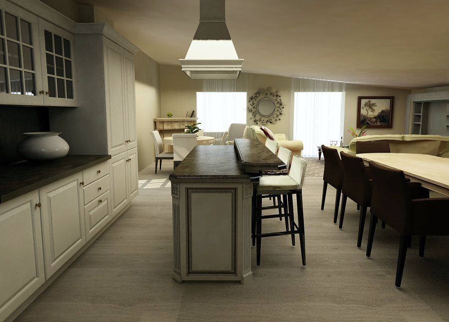 - prevedere una cucina all'americana, tipo da chef e con sgabelli per la colazione (non meno di tre, gradita isola). Sarà considerato un plus se la cucina sarà progettata con mobili ikea (che danno un'idea del prezzo). In allegato alcune foto della cucina ideale.
