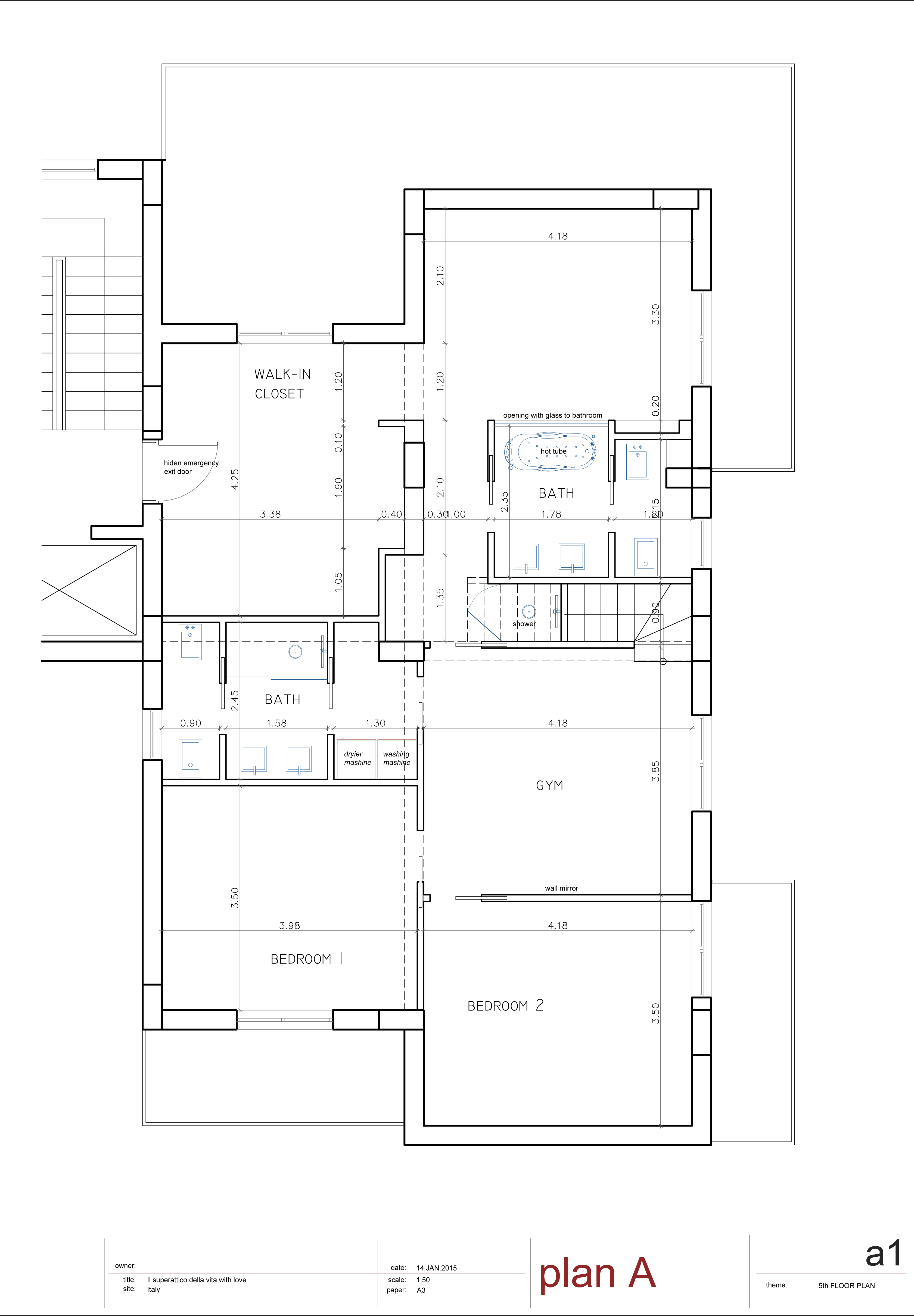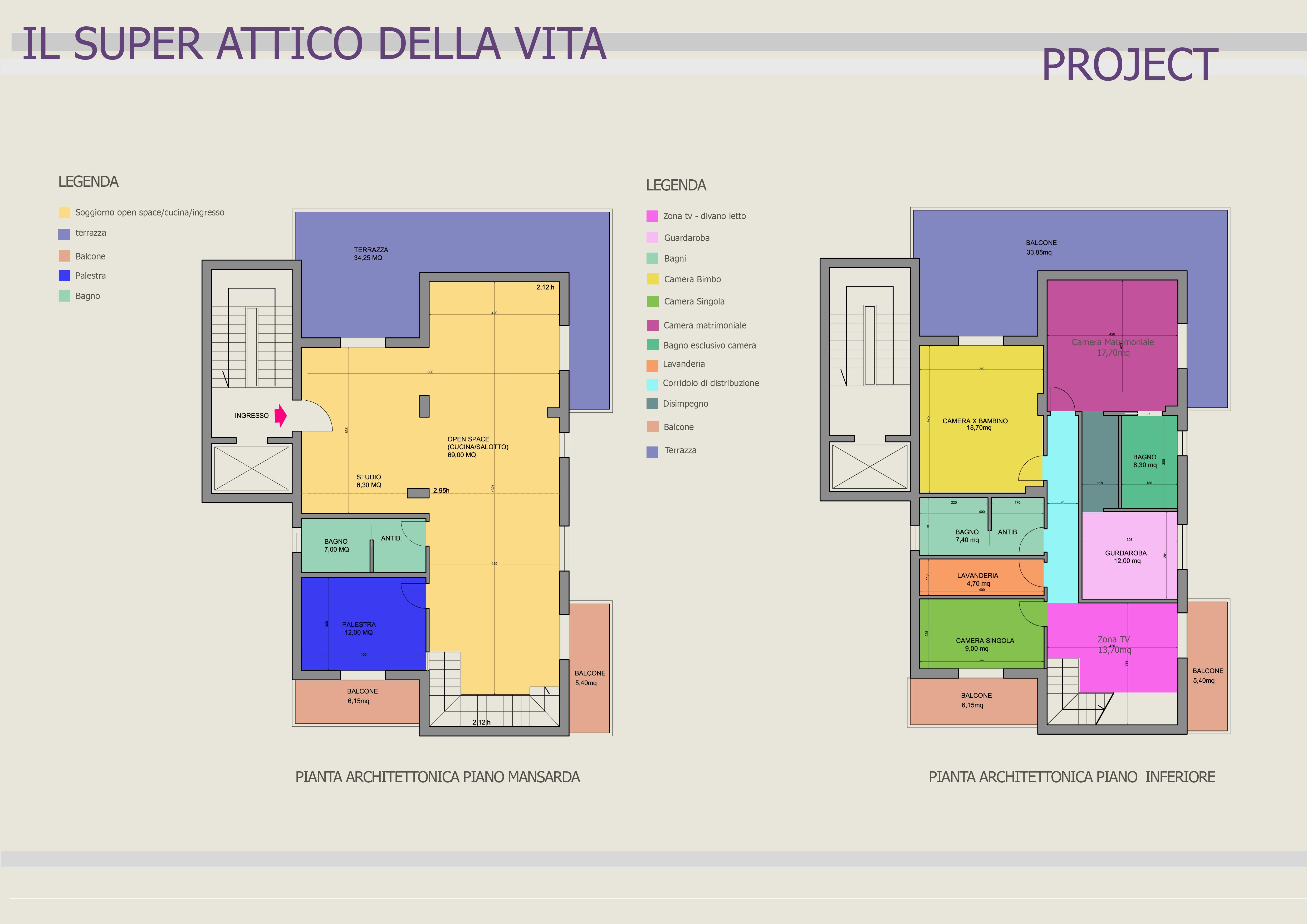 Trattasi di un appartamento su 2 livelli, circa 100 mq ciascuno, quello sotto è alto mt 2,95, mentre l'ultimo livello è leggermente mansardato (punto più basso 2,12 mt, più alto 2,95 mt). Si trova allo stato grezzo attualmente, quindi stiamo cercando la migliore divisione per i 2 piani. Al piano di sotto faremmo la zona notte, al piano di sopra (mansardato) faremmo la zona giorno. La piantina in allegato con disegnato 1 solo bagno, rappresenta il piano attico mansardato. Le linee tratteggiate al centro della piantina rappresentano il punto più alto della mansarda, che da lì in poi, scende.