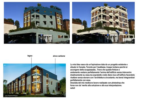 L'immobile è stato realizzato alla fine anni 60. Poiché sarà oggetto di riqualificazione energetica vorremmo "alleggerire" l'immagine senza alterare la sua anima (milanese ma non solo). Il IV e V piano saranno oggetto di altra e diversa completa ristrutturazione che dovrà integrarsi. Non deve sembrare solido ma efficiente (inutile dirlo...energetico, ma non solo). Bellezza giorno e di notte, acqua e sapone... Angolo terrazzo ultimo piano (senza copertura) sud-est si potrebbe ampliare in trasparenza per dare copertura al sottostante.