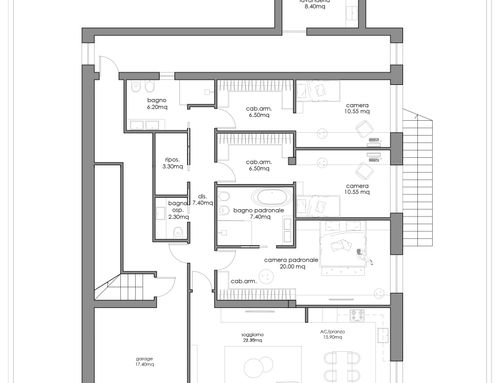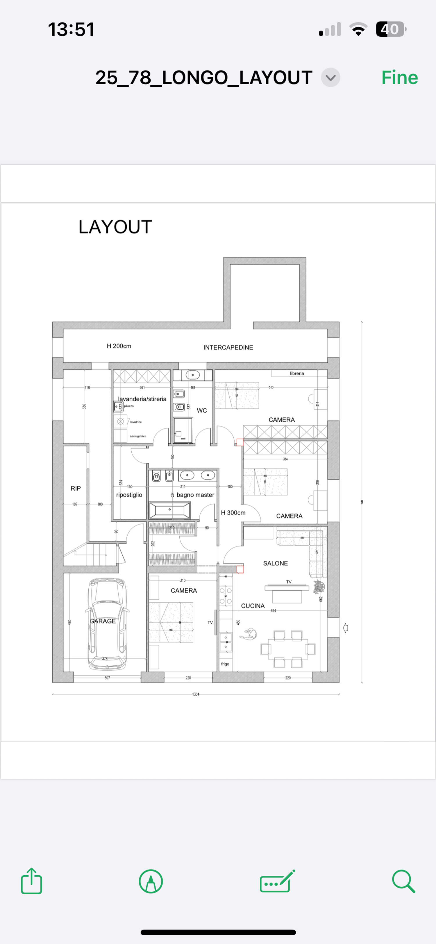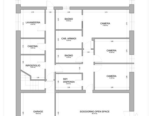 Il allegato ci sarà la planimetria attuale dell'immobile, dove a destra c'è il garage e a sinistra l'appartamento ma dovrà essere disposto al contrario, a destra l'appartamento e a sinistra il garage. Bisognerà lasciare più o meno 4 metri per il garage e uno spazio per il passaggio per andare nell'intercapedine con una lavanderia.