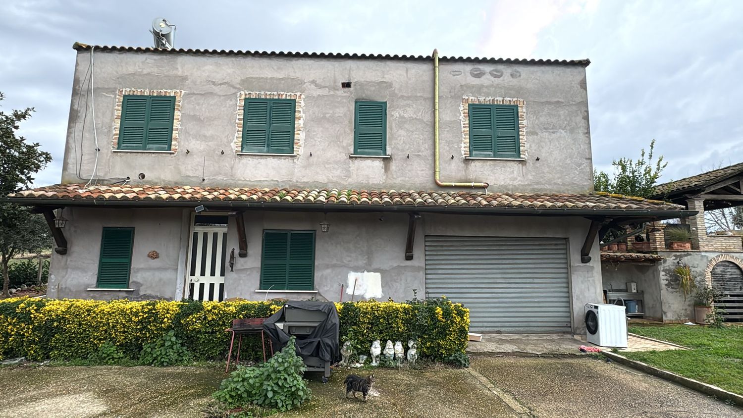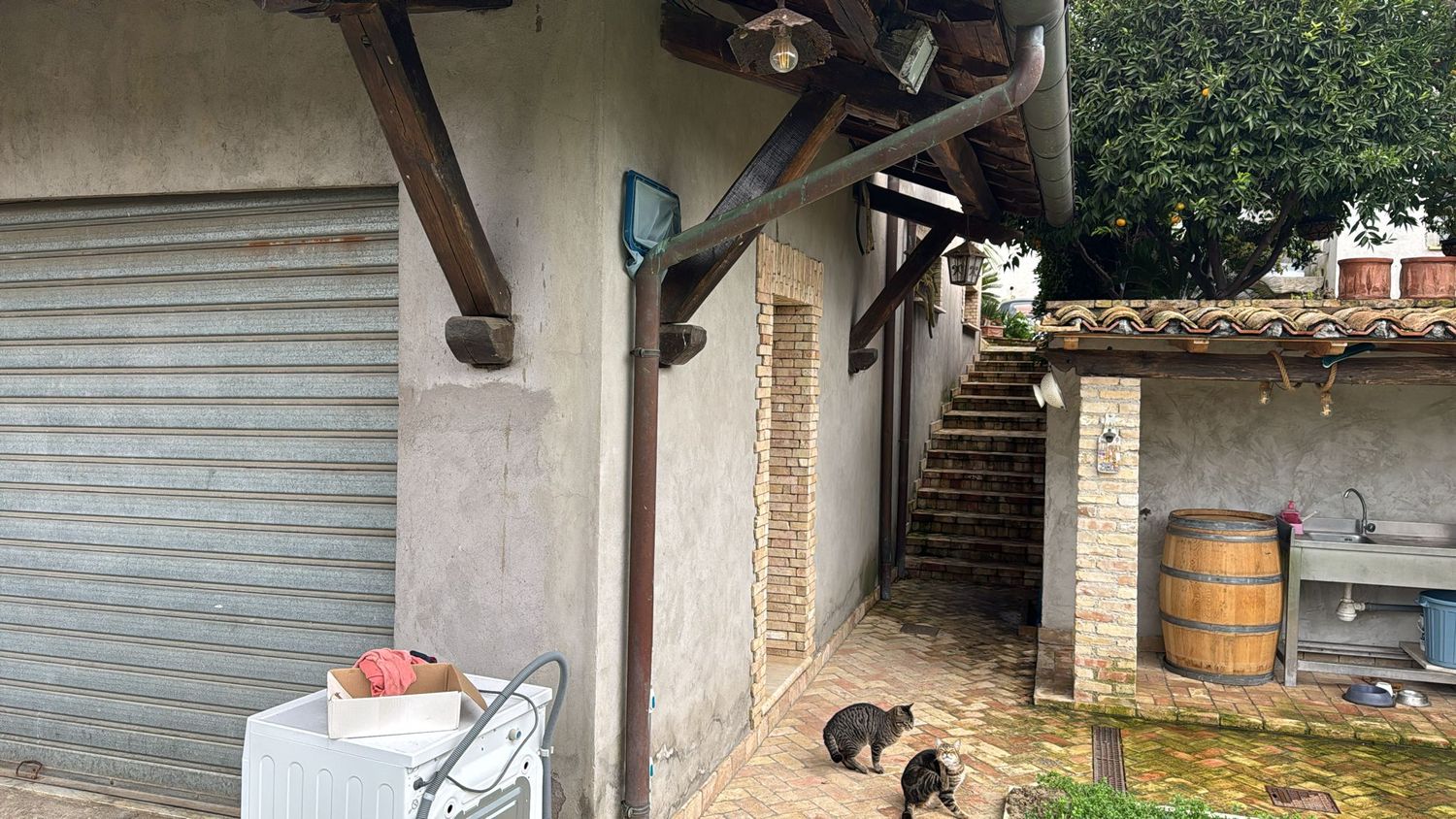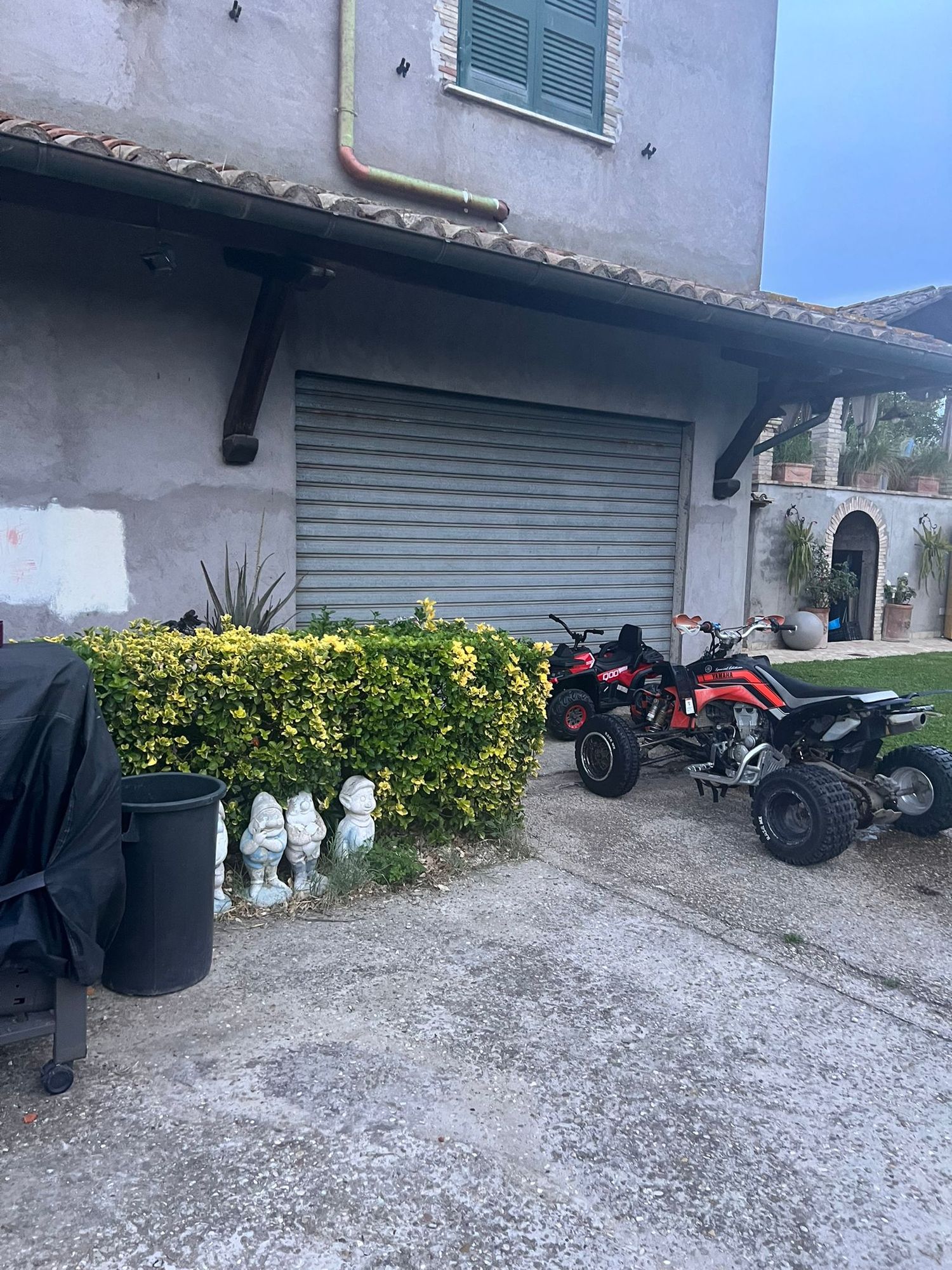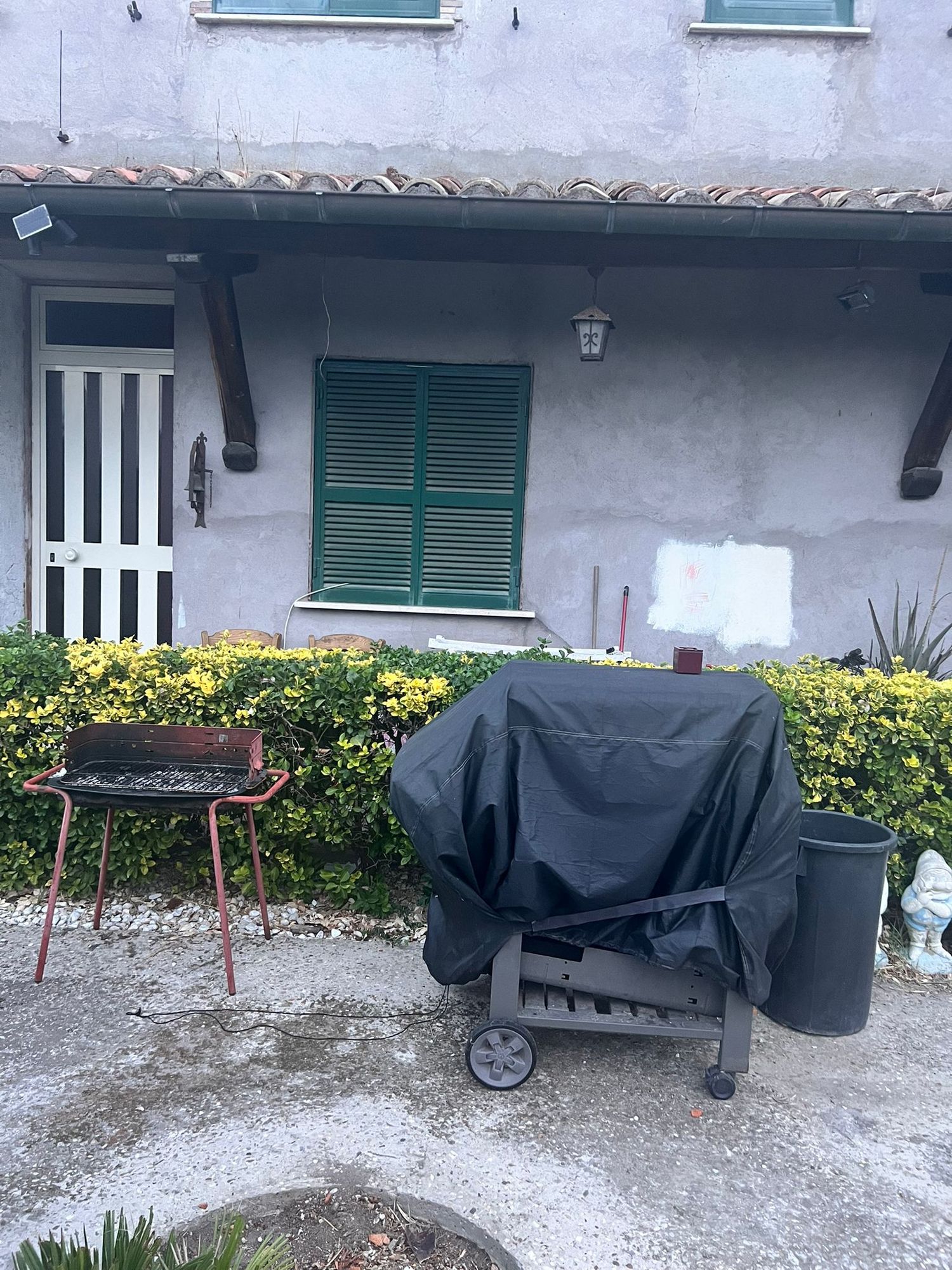 La casa è un mezzo seminterrato e, nella parte davanti c'è lo spiazzale con il giiardino e la piscina.