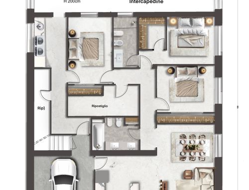 Nella casa ci dovranno essere 3 camere da letto e due bagni, uno possibilmente nella camera padronale con una cabina armadio. Nel bagno padronale vorrei mettere una vasca con una doccia walk-in. Avrei bisogno di un ripostiglio. Vorrei un soggiorno con cucina a vista, no lineare, se fosse possibile mi piacerebbe avere un piano snack dove porter fare colazione.
