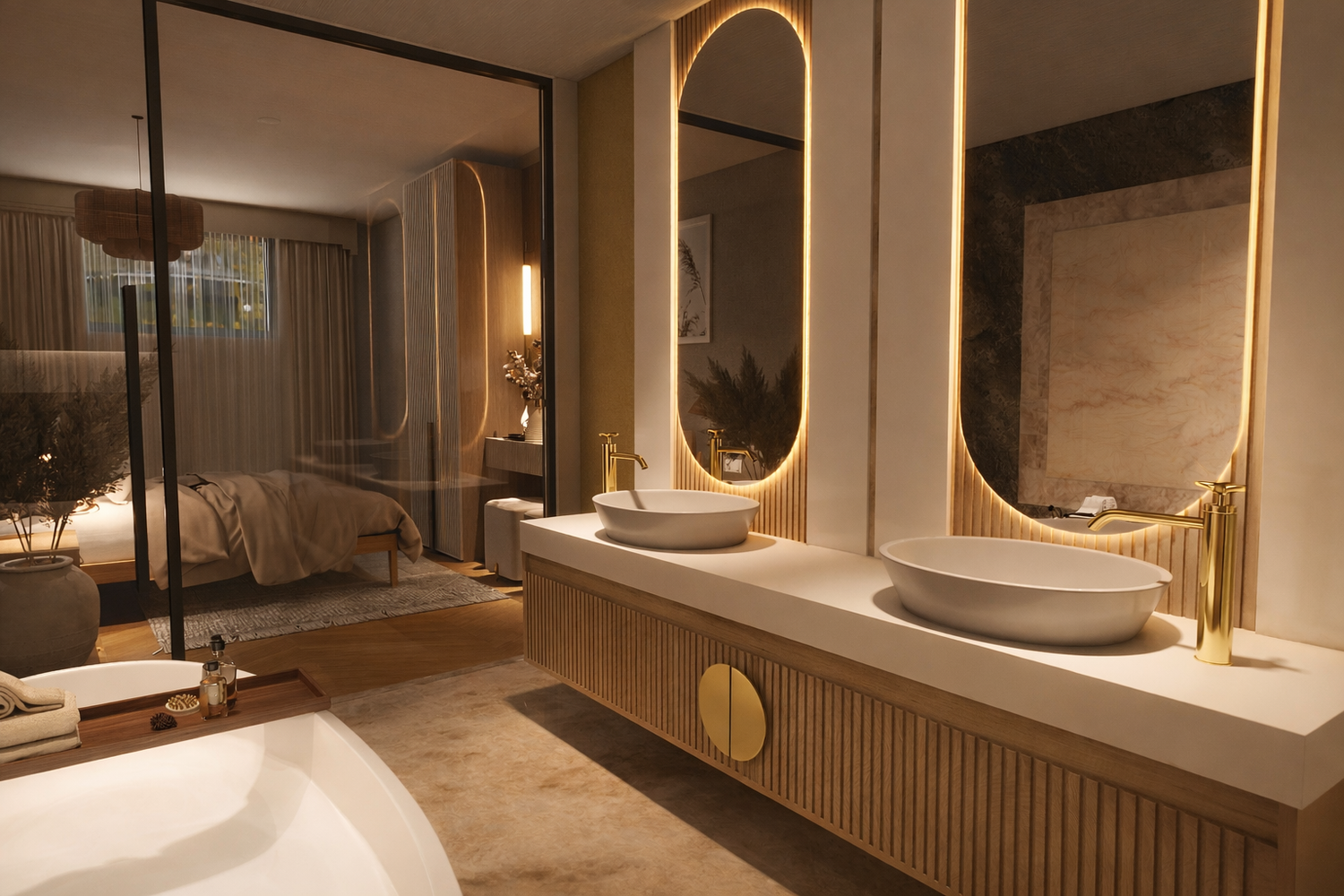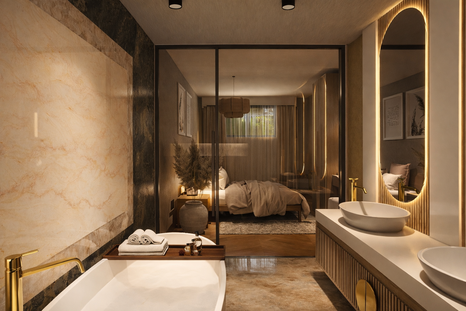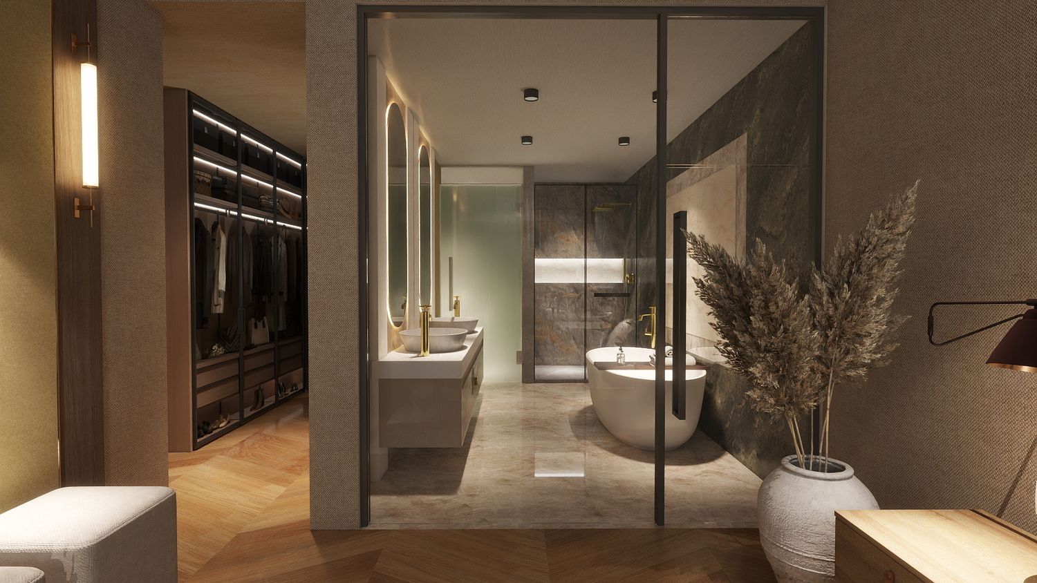 In tutte le soluzioni, la camera padronale è dotata di bagno en suite, concepito come uno spazio di forte carattere, con doccia walk-in e vasca freestanding, WC separato e un linguaggio formale dal forte valore scultoreo. In due delle proposte, l’intero ambito della camera matrimoniale è stato pensato in chiave scenografica, con un impatto visivo marcato e una continuità fluida tra zona notte, cabina armadio e bagno.