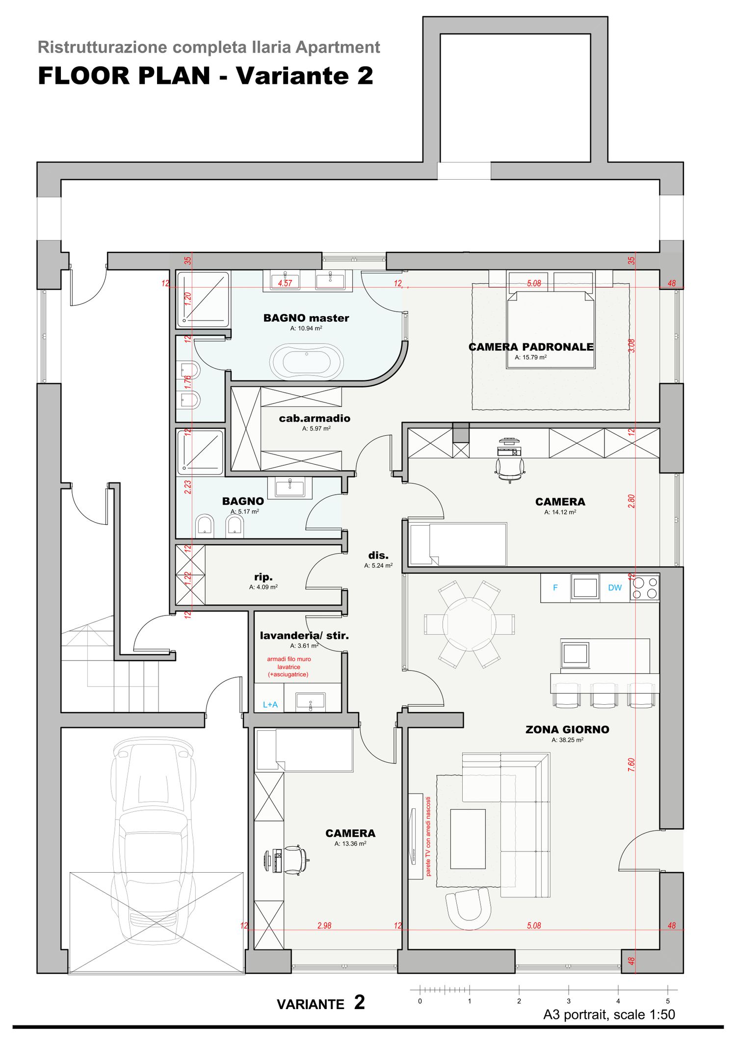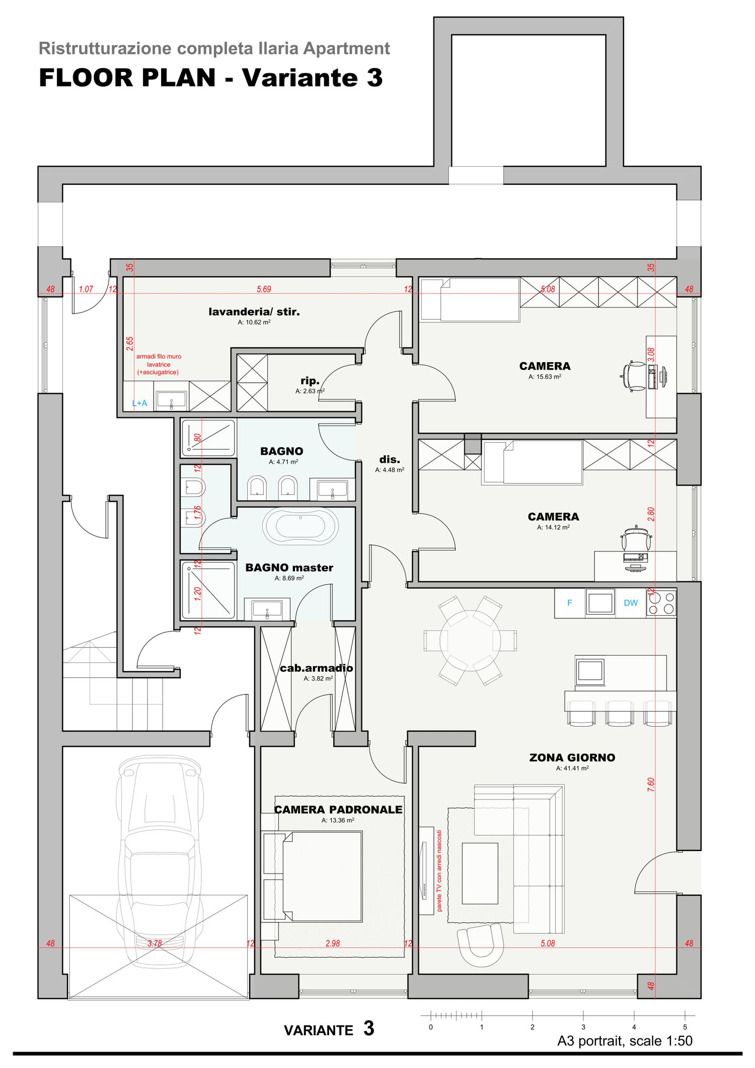Sono state sviluppate tre diverse proposte planimetriche, con l’obiettivo di illustrare tre differenti modalità di organizzazione della zona giorno, mantenendo invariata la logica distributiva della zona notte.