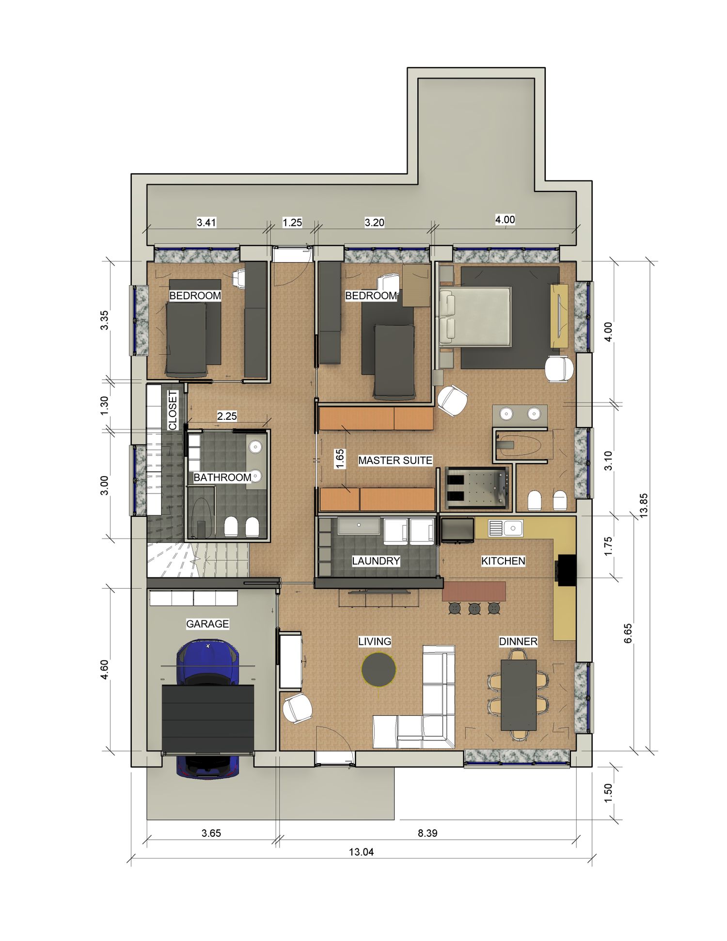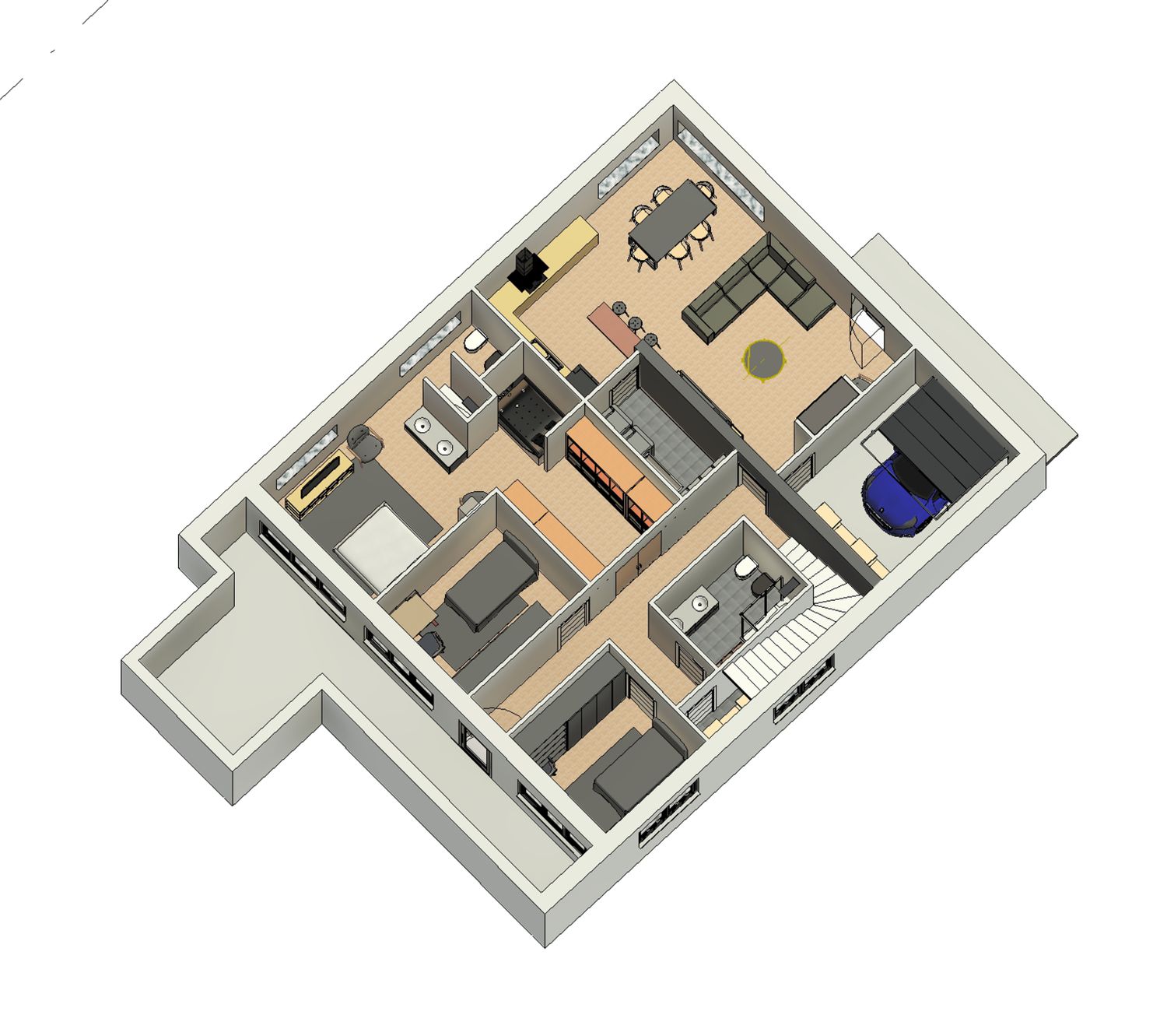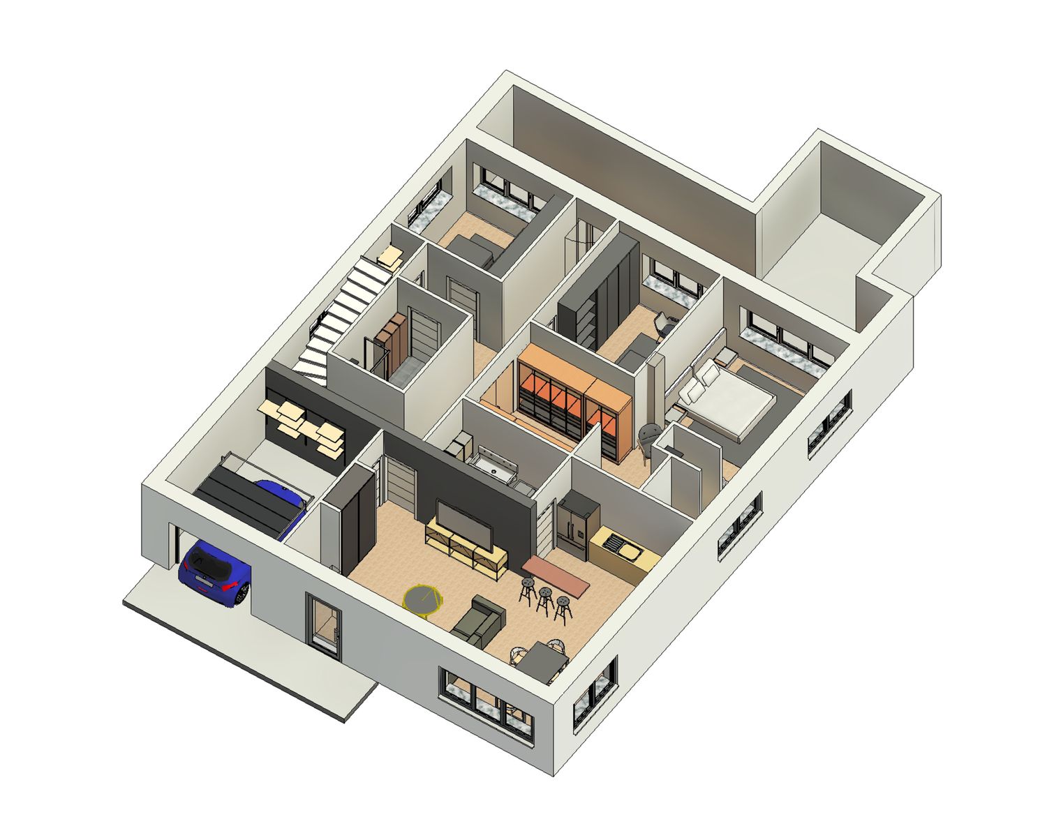 The en-suite bathroom is designed with direct natural ventilation. Conversely, the secondary bathroom and the laundry room require mechanical (forced) ventilation. The ventilation duct for the secondary bathroom is proposed on the left side, beneath the stair structure, while the laundry room ventilation is located on the right side, with the duct fully concealed within the upper kitchen cabinetry.