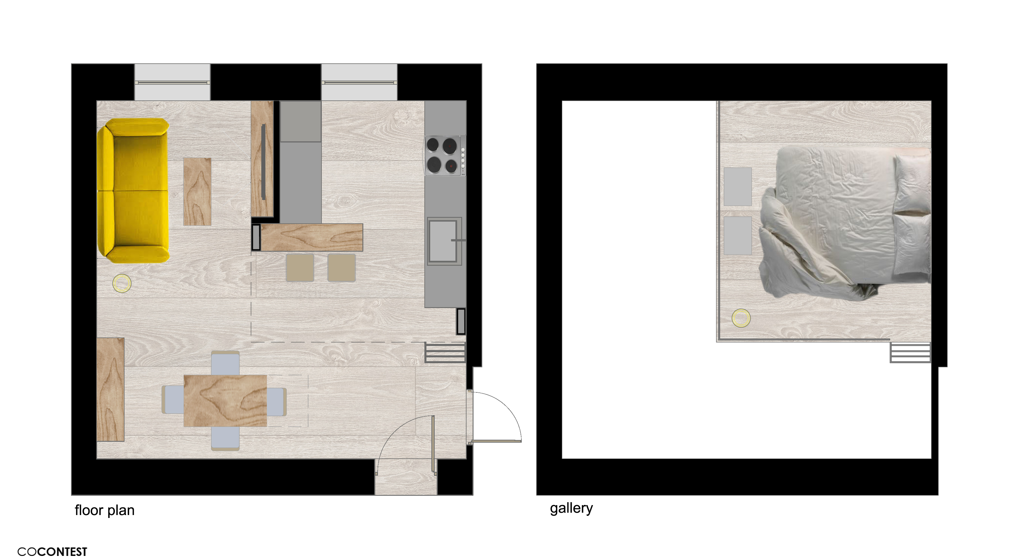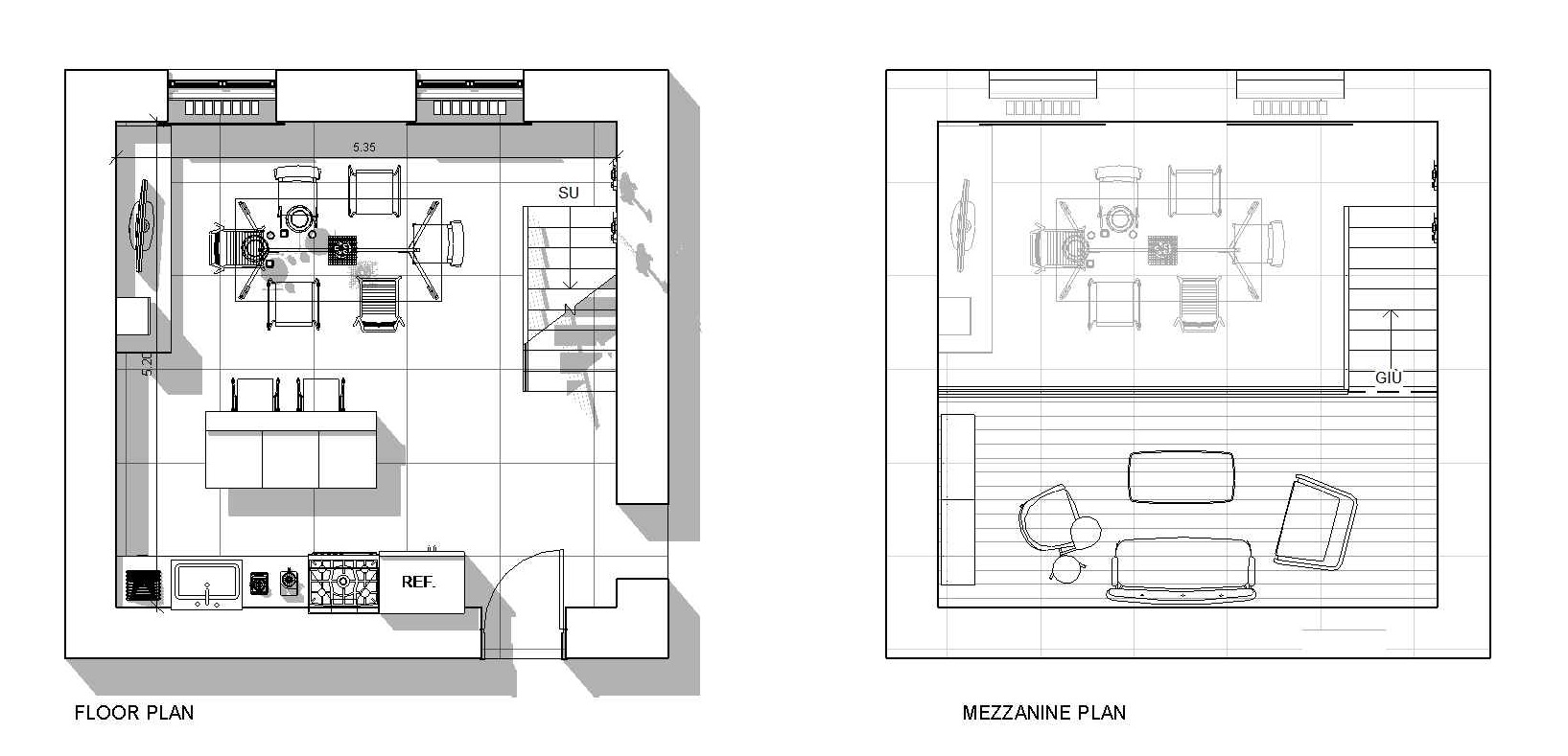 Unico spazio con cucina (vorrei mantenere la cucina già presente in casa) e zona soggiorno. il soffitto alto consente un soppalco.