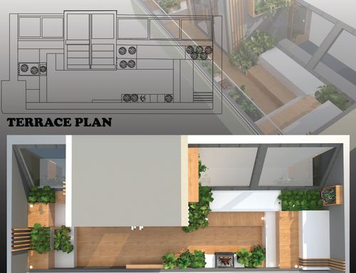 Raise all the flooring because the height of the perimeter wall makes the view of the sunset scarce and we would like to have aperitifs with a view. We would like to create a perimeter seats to have sunbathe in summer. We would like a table patio heater or gas fireplace. We like lounge style lights and we want to use it in the evening / night. We love modern/design style, white color and wood material.