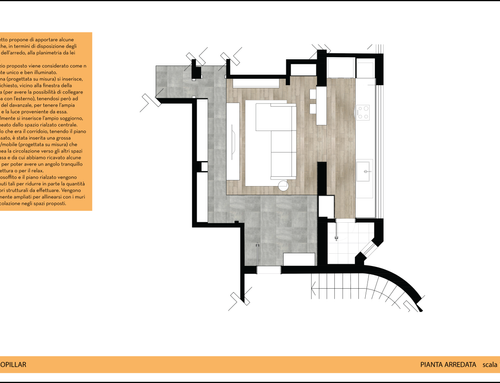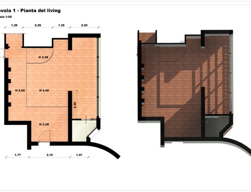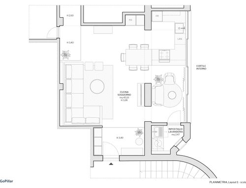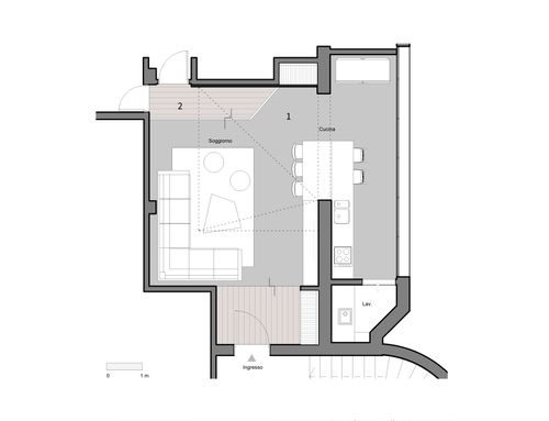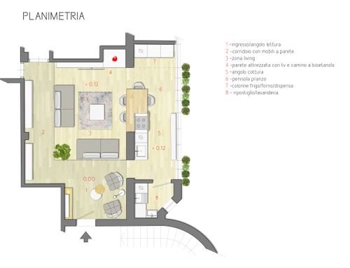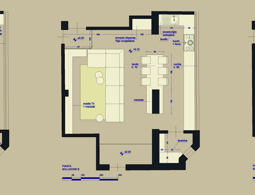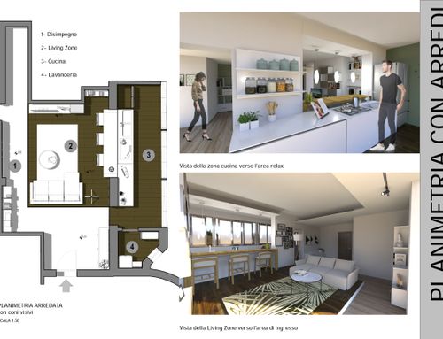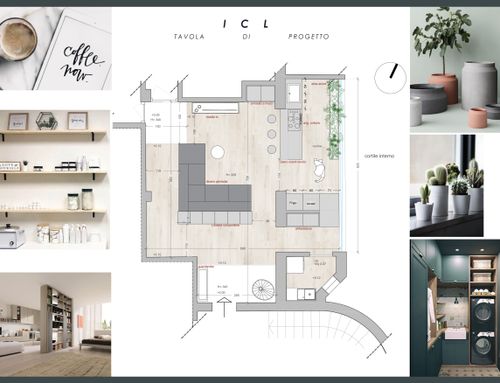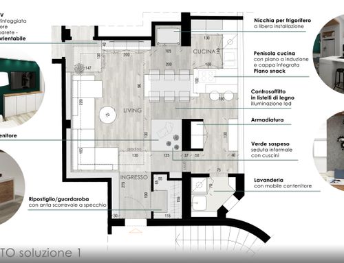 Stile moderno con elementi classici in contrasto. amiamo il verde. Vogliamo rendere unico l'ambiente indicato in planimetria, che funga da ingresso, cucina, living. Pensiamo quindi di demolire il tramezzo che definisce il corridoio.