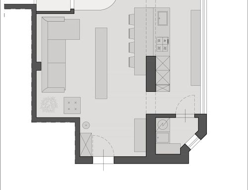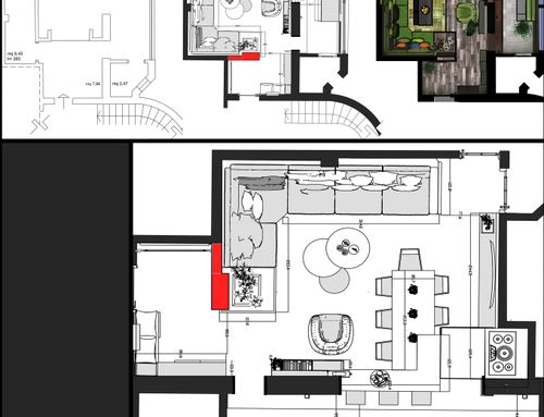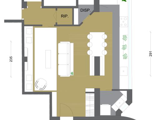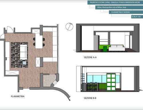 Modern style with classic contrasting elements. We love green. We want to redesign the space indicated in the plan into a single space acting as entrance, kitchen and living room. Therefore, we plan to remove the partition that defines the corridor.I