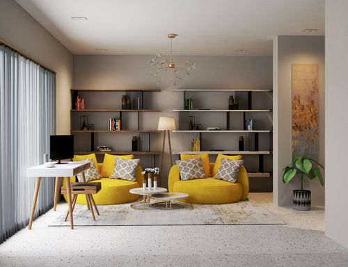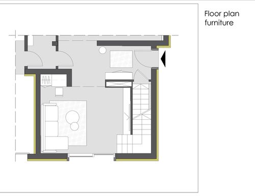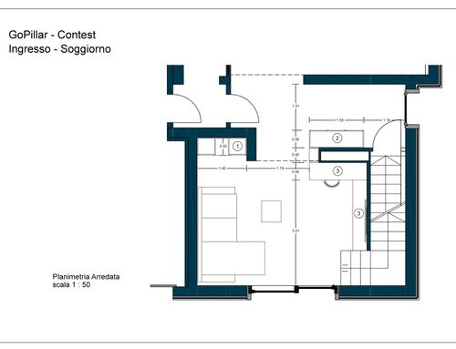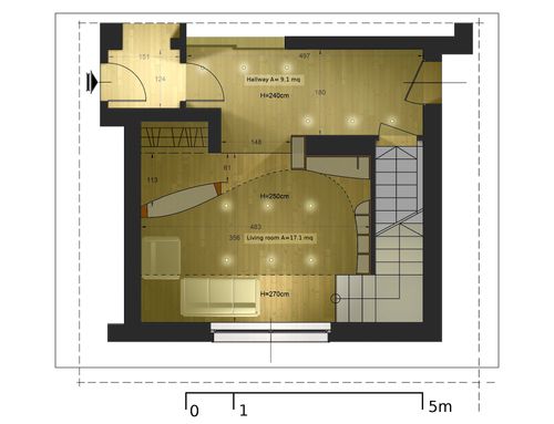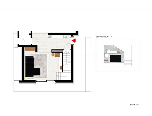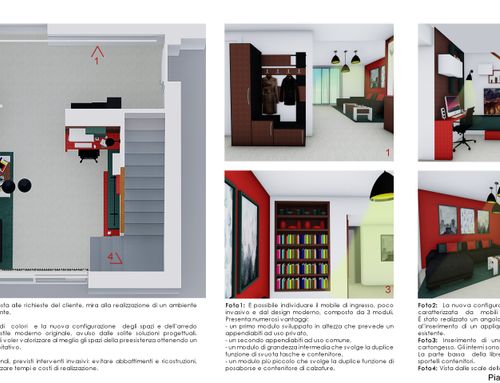 I have to furnish the entrance to the house and the connected living room with modern style and warm colors. In the entrance I would like to be able to insert a piece of furniture that does not create too much impact and at the same time that can contain various things. In the living room I should find a solution for the TV wall (towards the stairs on the first floor) that needs to be enhanced. in a corner of the TV area I would like to be able to create a kind of desk / shelf for a PC trying to take advantage of the corner. In the niche next to the sofa I should make a wardrobe / bookcase as a container. Of the current furniture (recovered from the old house) I would like to be able to recover the sofa.