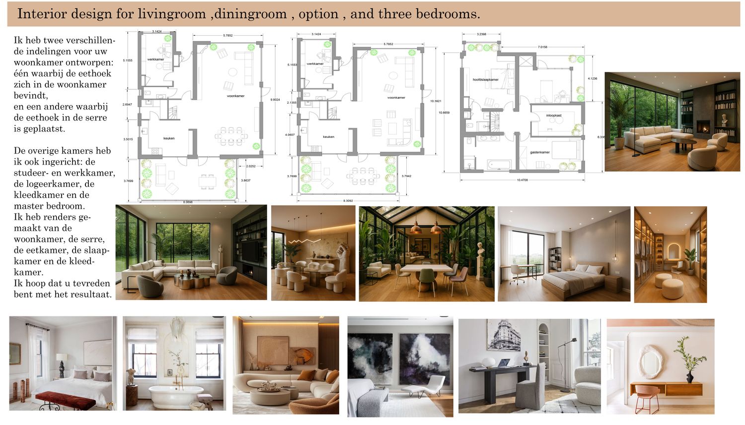 Ik heb renders gemaakt van de woonkamer, de serre, de eetkamer, de slaapkamer en de kleedkamer.