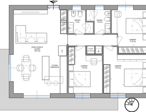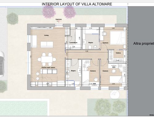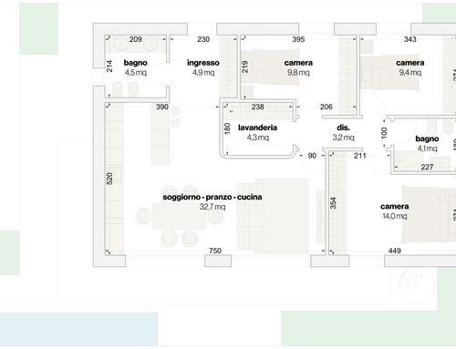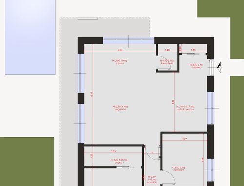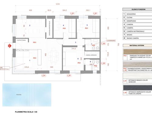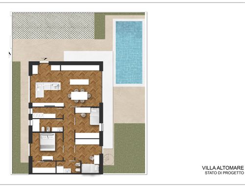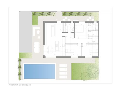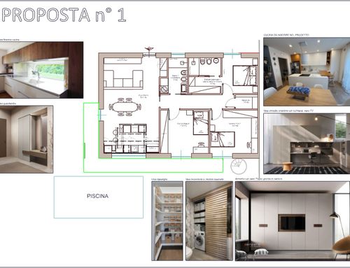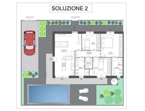Vorrei una casa moderna e funzionale. Necessito di 3 camere da letto (1 matrimoniale + 2 per i due figli), 2 bagni, che la zona giorno si adatti alla cucina (meglio se con visuale sulla piscina) che è già in mio possesso e di riuscire a ricavare uno spazio per ospitare una piccola lavanderia interna. Altro piccolo dettaglio ci piacerebbe se nella zona d''ingresso fosse possibile ricavare uno spazio per una cappottiera. Al momento la villa deve essere ancora edificata per cui c'è massima libertà per quanto riguarda il posizionamento degli infissi e dell'ingresso principale.